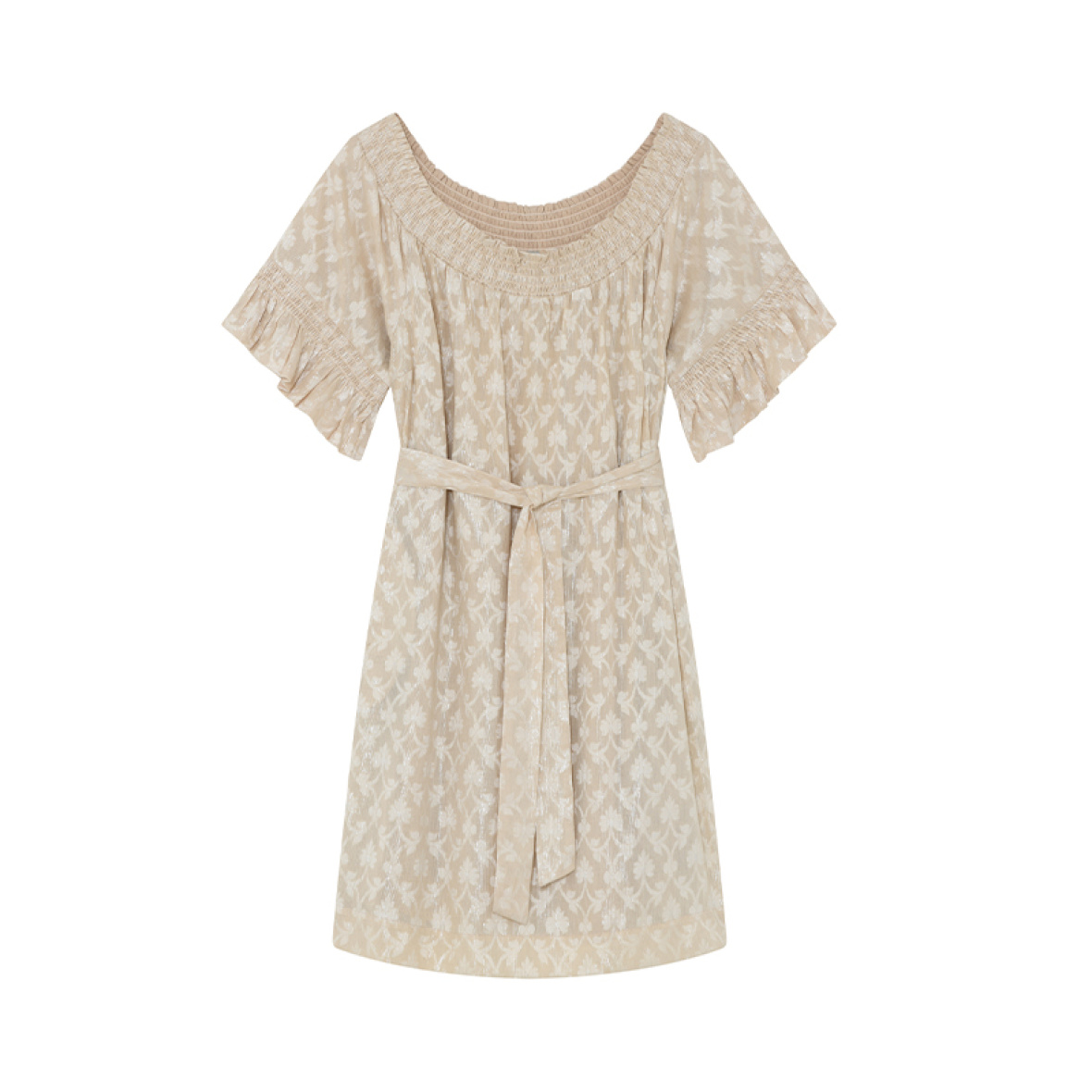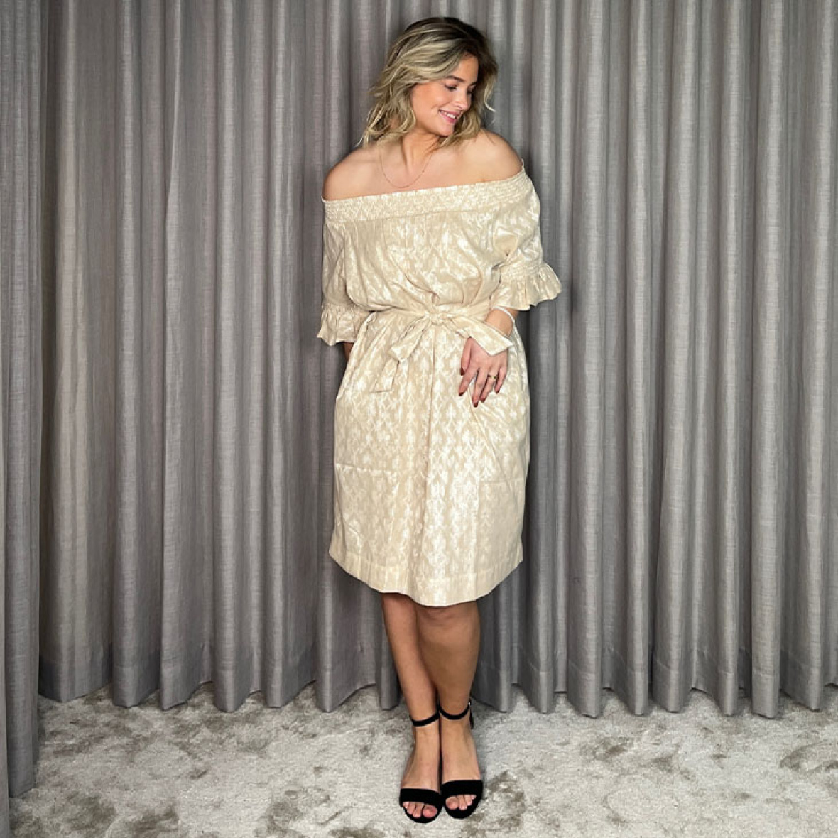 Feminin kjole fra Gustav med ½ lange ærmer, bådudskæring og bredt bindebånd i taljen.