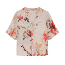 Skjorten har et enkelt snit med v-udskæring, gennemknappet og halvlange, løstsiddende ærmer.