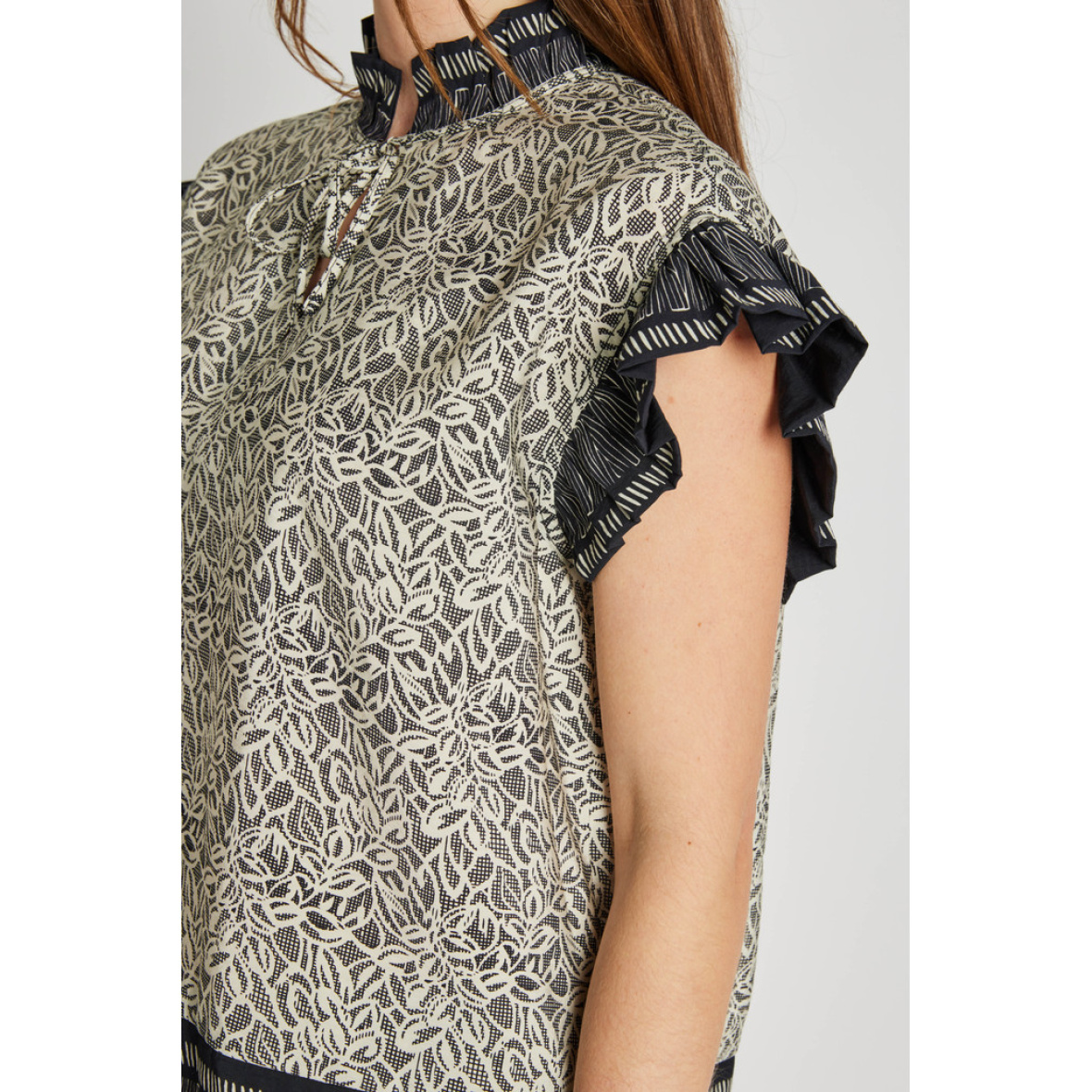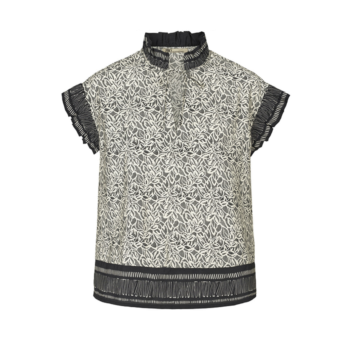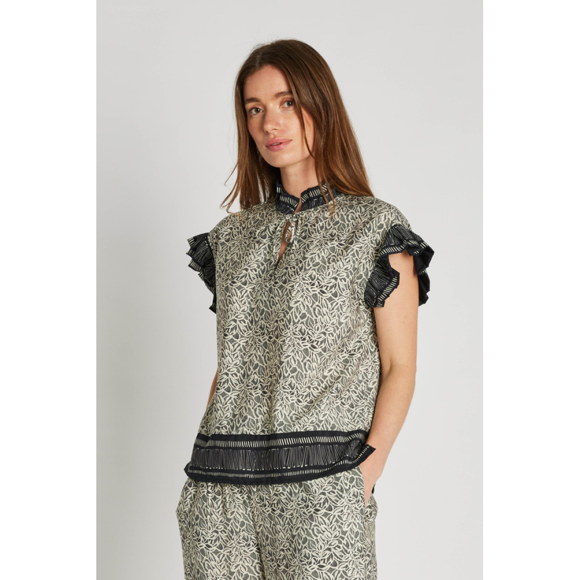 Vipo Noda toppen er en feminin og luftig top med smukke flæsedetaljer og et grafisk mønster. Et let og stilfuldt tilskud til garderoben.