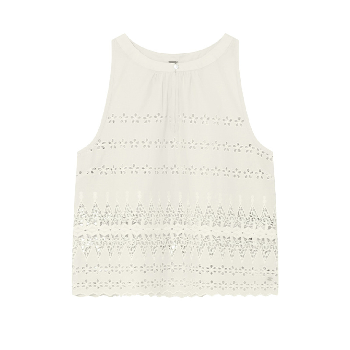 Den ærmeløse Alisha top fra Gustav er indbegrebet af sommerstemning med sit fine broderie anglaise-mønster og lette bomuldsmateriale. Toppen har rund halsudskæring med en lille knaplukning i nakken, og det flotte hulmønster i bunden giver et feminint og elegant udtryk. Perfekt til både jeans, shorts og nederdele – og ideel til alt fra strandture til sommerfester.
