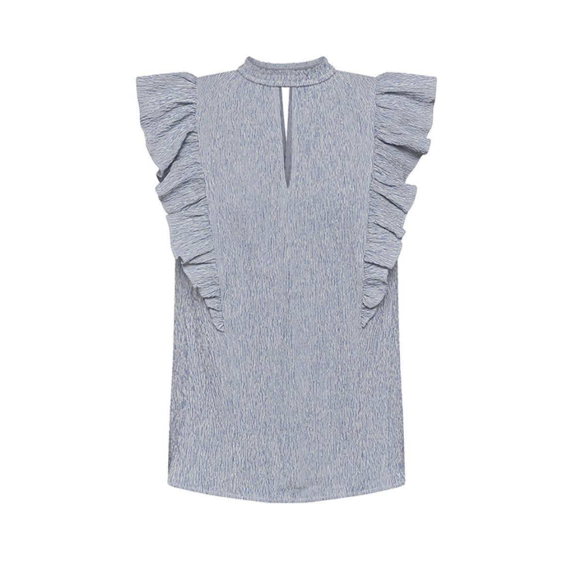 Love1327 er en elegant bluse med en høj hals og fine, små flæseærmer, der giver et feminint og sofistikeret udtryk.