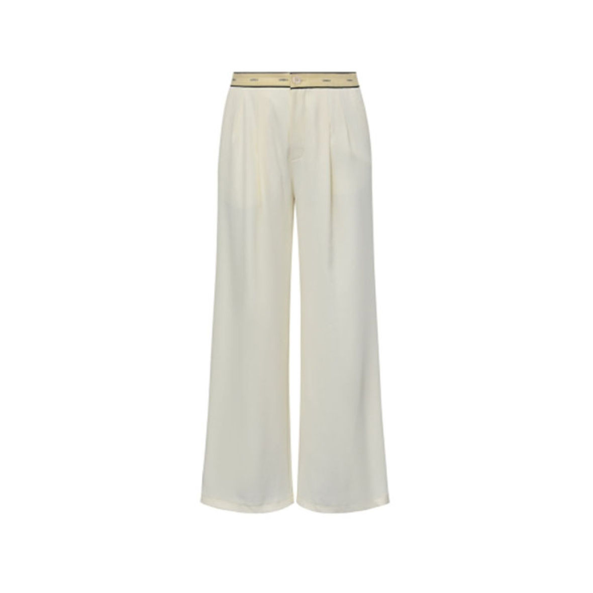 Disse cremehvide bukser kombinerer komfort og elegance på fineste vis. Det brede ben giver et luftigt og feminint udtryk, mens den elastiske talje med diskret logodetalje tilføjer et sporty twist. Bukserne falder flot og let, og de kan nemt styles med alt fra en enkel top til en skjorte eller blazer. Ideelle til både afslappede dage og særlige lejligheder, hvor du gerne vil være stilfuldt klædt på – uden at gå på kompromis med komforten.
