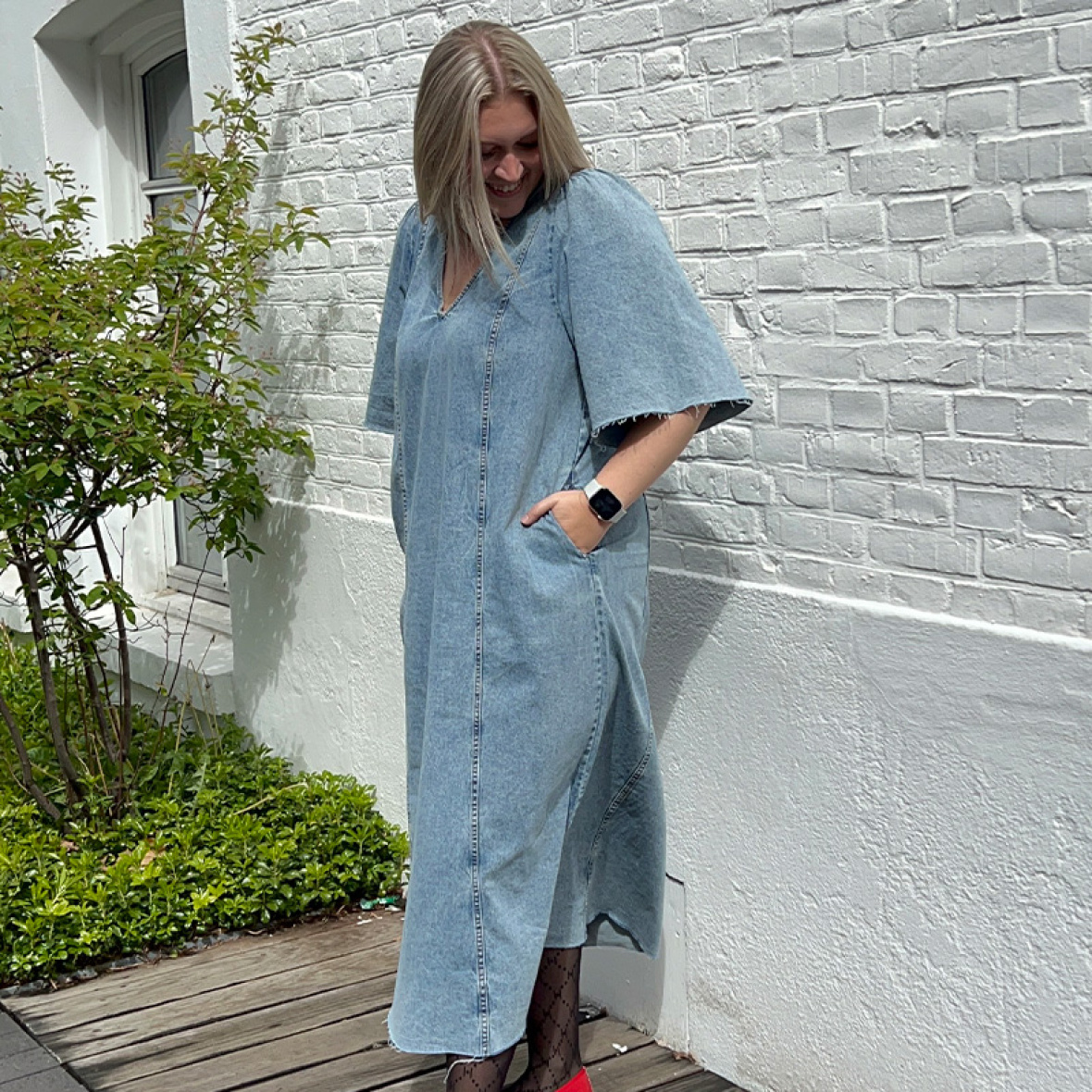 Denim kjole fra Haute L'amitié er en cool denimkjole med V-udskæring og albuelange ærmer med let puf.