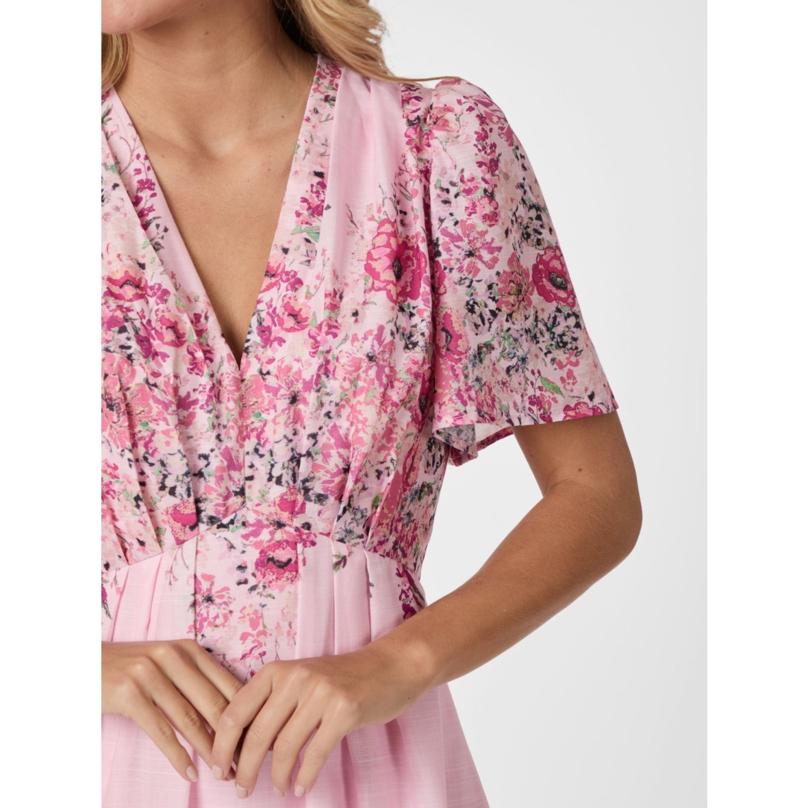 Kjolen har korte, vide ærmer, der giver et let og luftigt udtryk – perfekt til varme dage eller som et elegant hverdagslook.