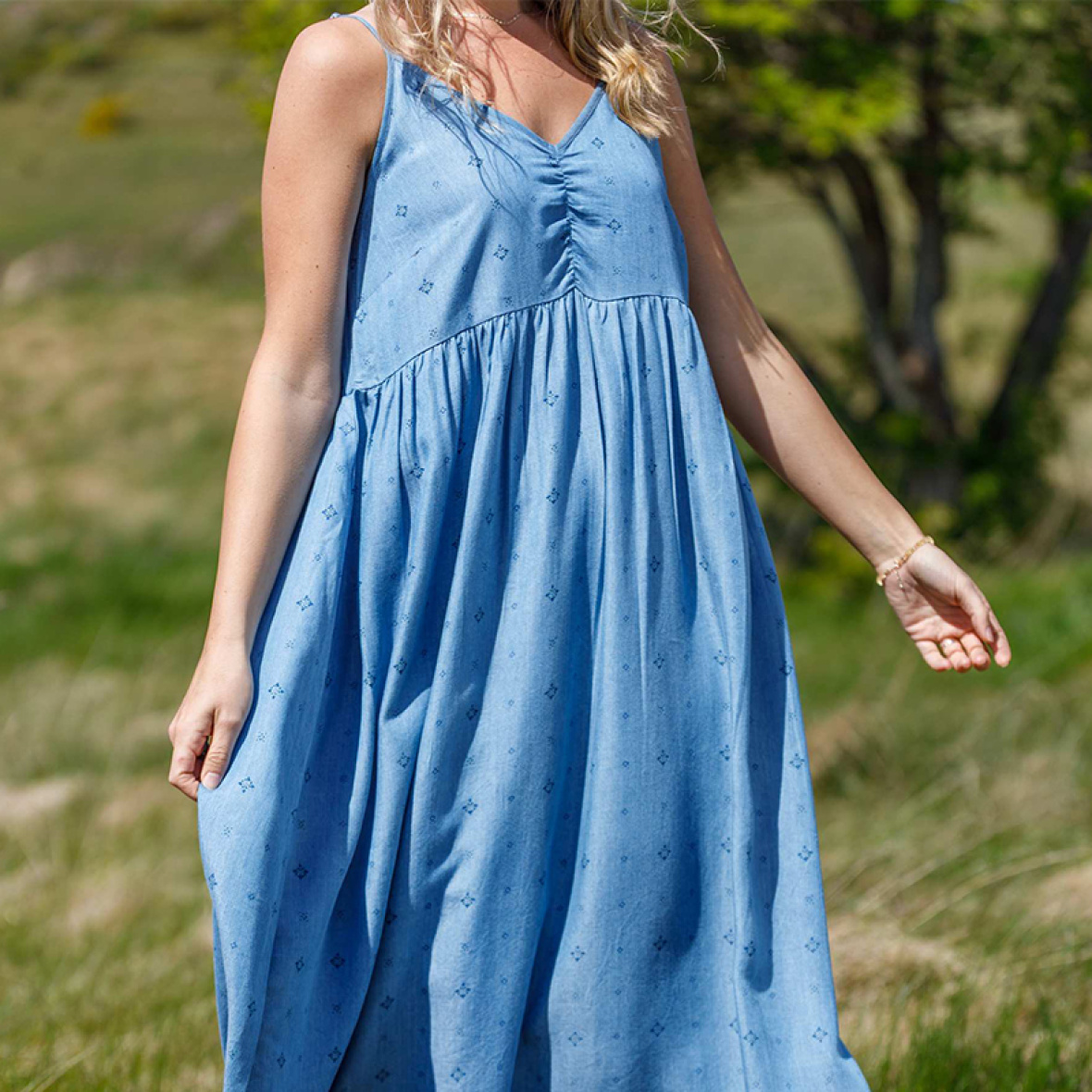 Smuk, lyseblå sommerkjole med tynde stropper og et fint, diskret mønster.