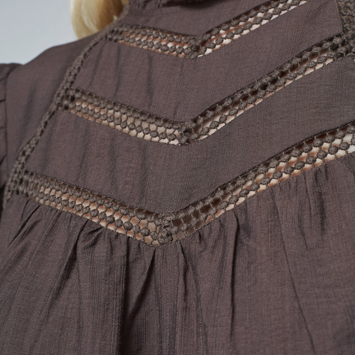 Love & Divine Love1374 Top i brun er en feminin og let bluse med fine flæsedetaljer på ærmerne.