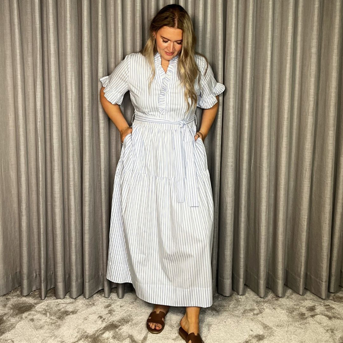 Let og elegant midi‑kjole i blød poplin med lyseblå og hvide striber.