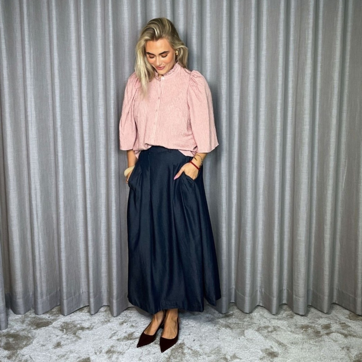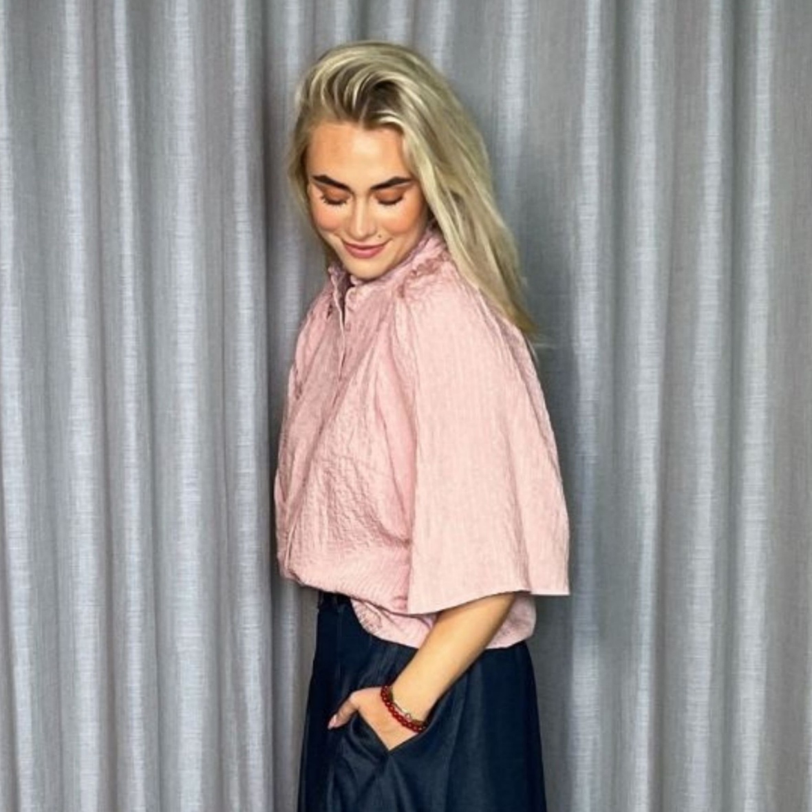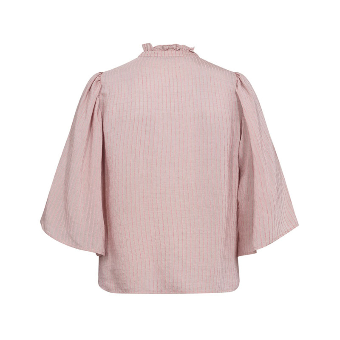 Let og feminin lyserød bluse med fine striber, vide ærmer og flæser i halsen.