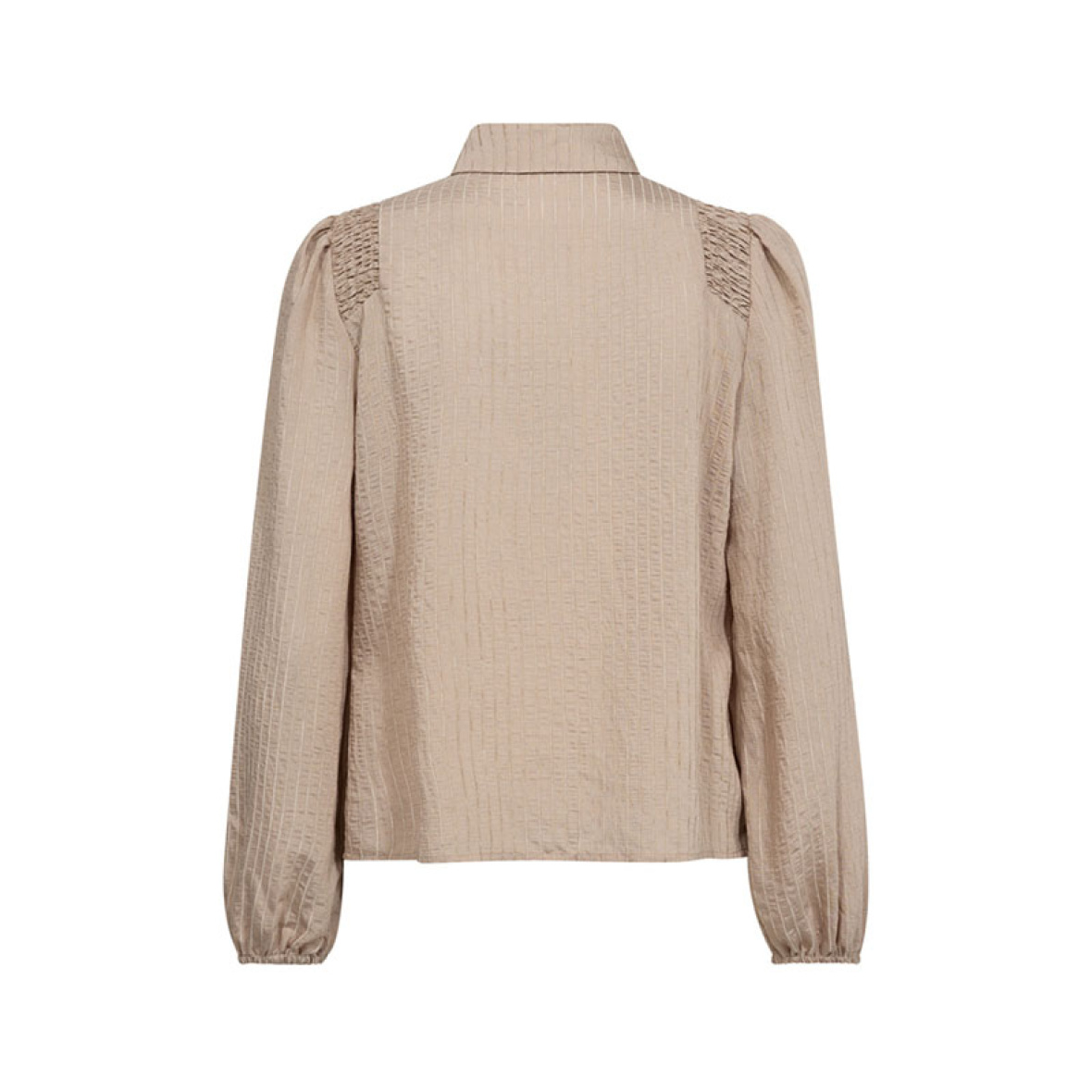 Let og feminin brun skjorte med fine striber, lange ærmer og en flot krave.