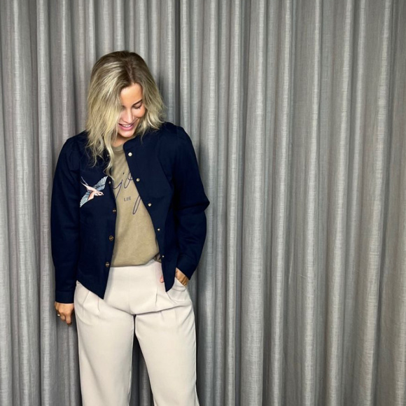 Elegant jakke med skinnende guldknapper langs midten og smukke fuglebroderier på brystet og ryggen.