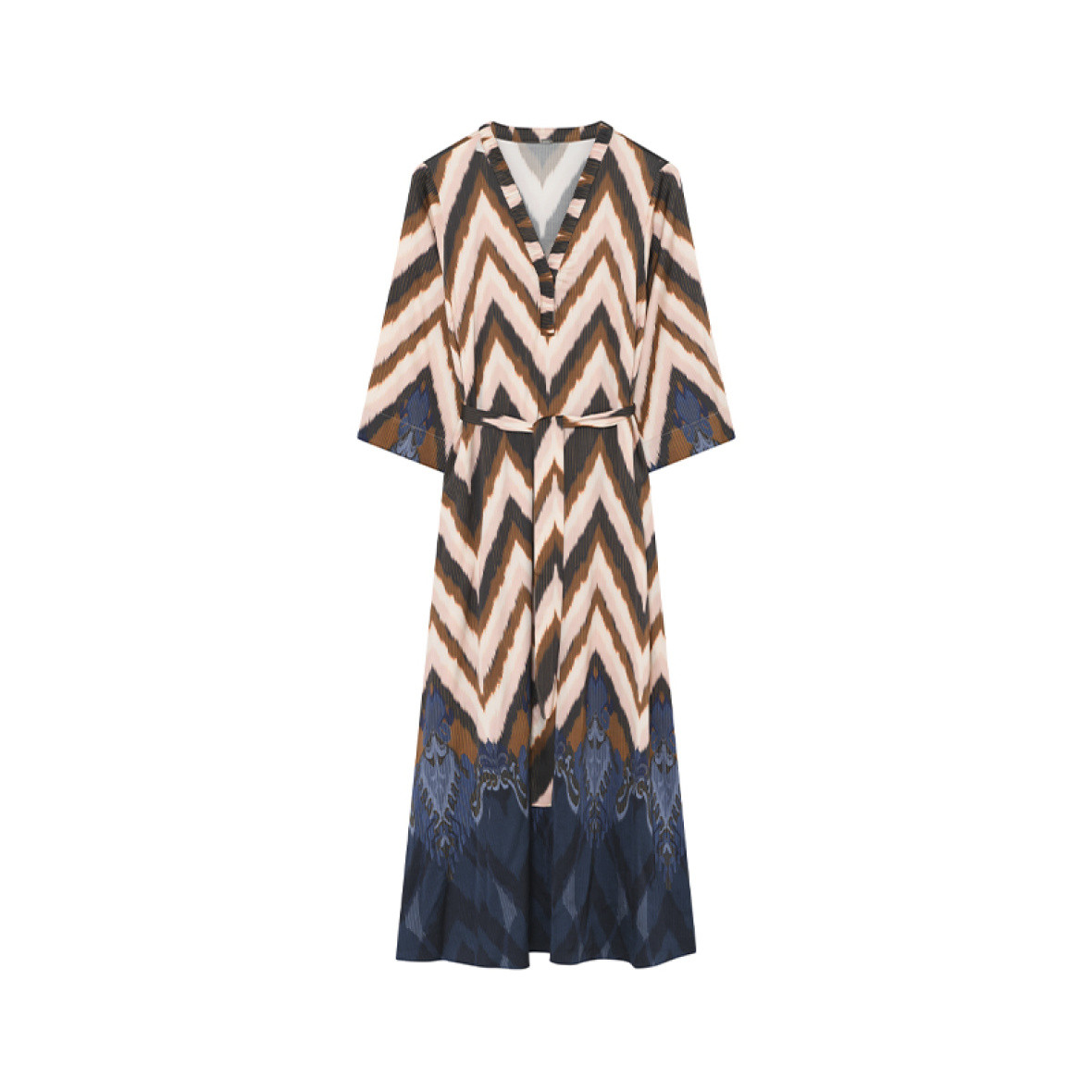 Den lange silhuet kombineret med en v-udskæring skaber et let og flatterende look, mens bindebåndet i taljen fremhæver figuren på en smuk måde.