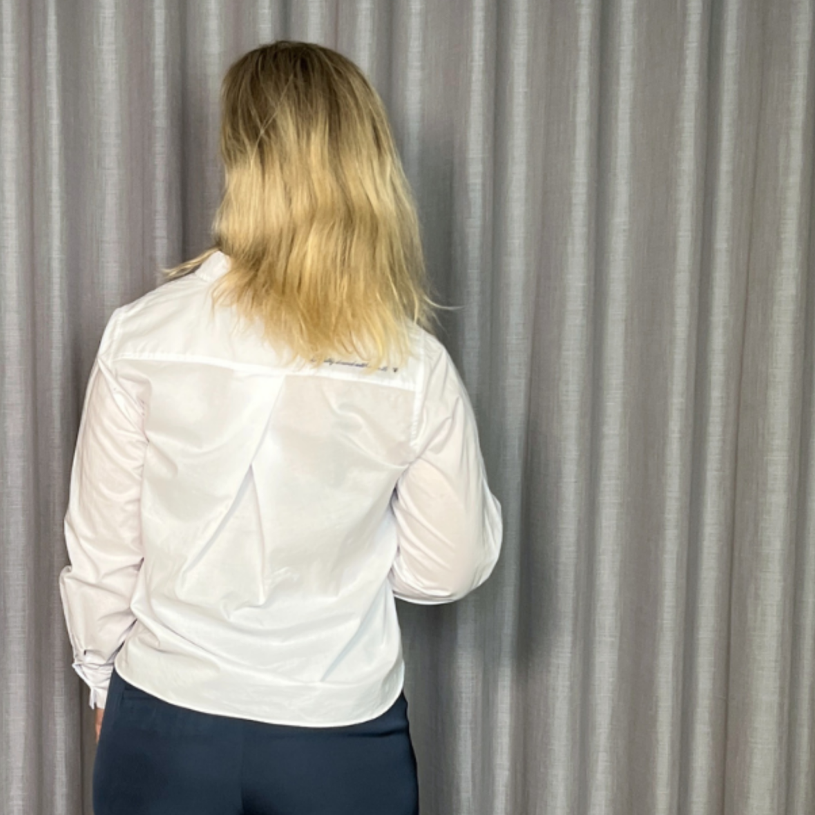 Som en smuk og diskret detalje finder du småt skrift bag på skulderen samt nederst ved ærmets kant – et unikt touch, der giver skjorten personlighed.