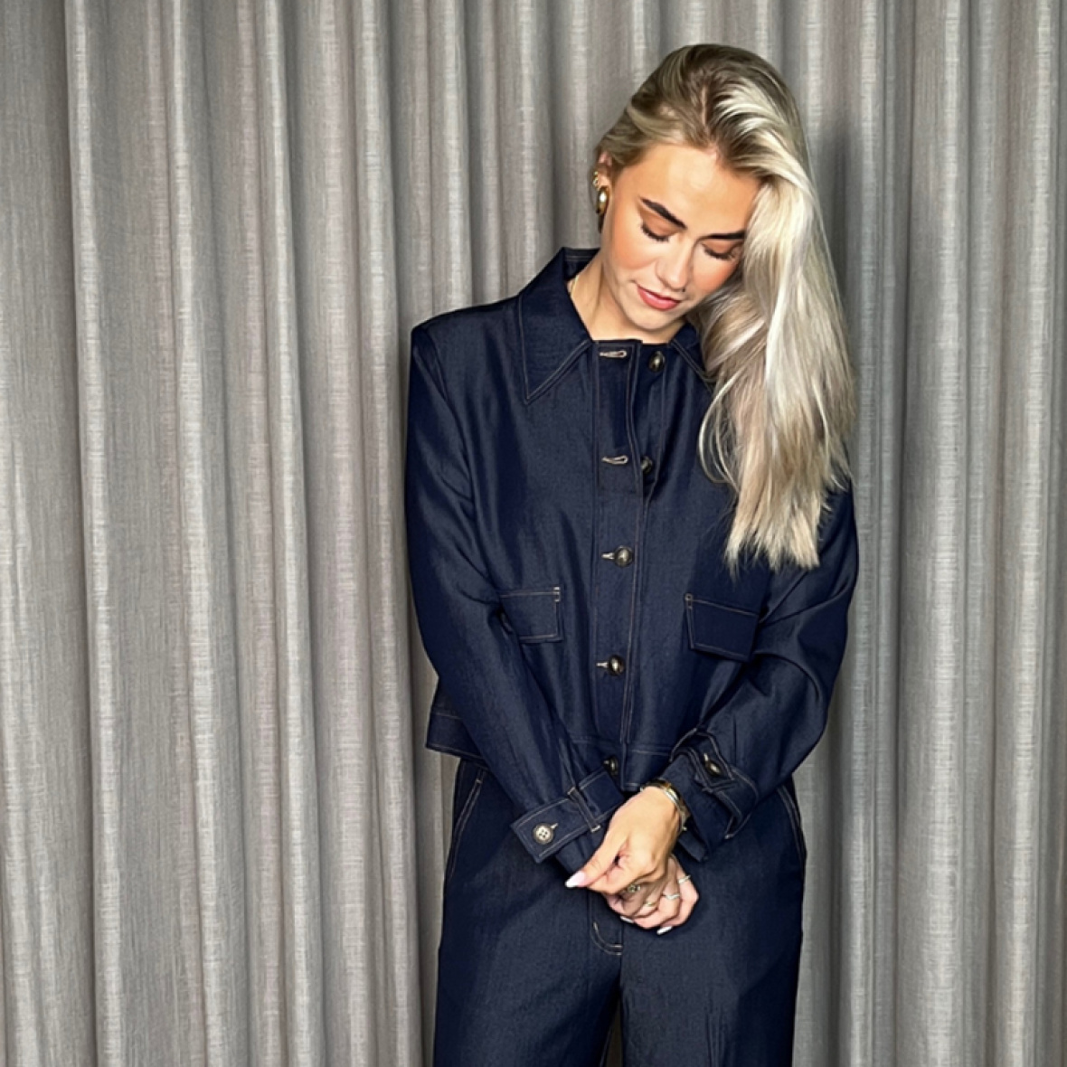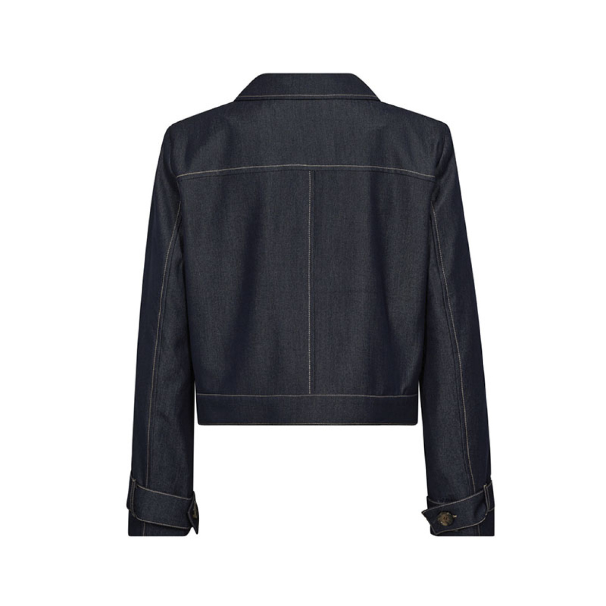 Jakken er designet i en mørk denimvask med tydelige kontrastsyninger, som giver et moderne og stilfuldt udtryk.