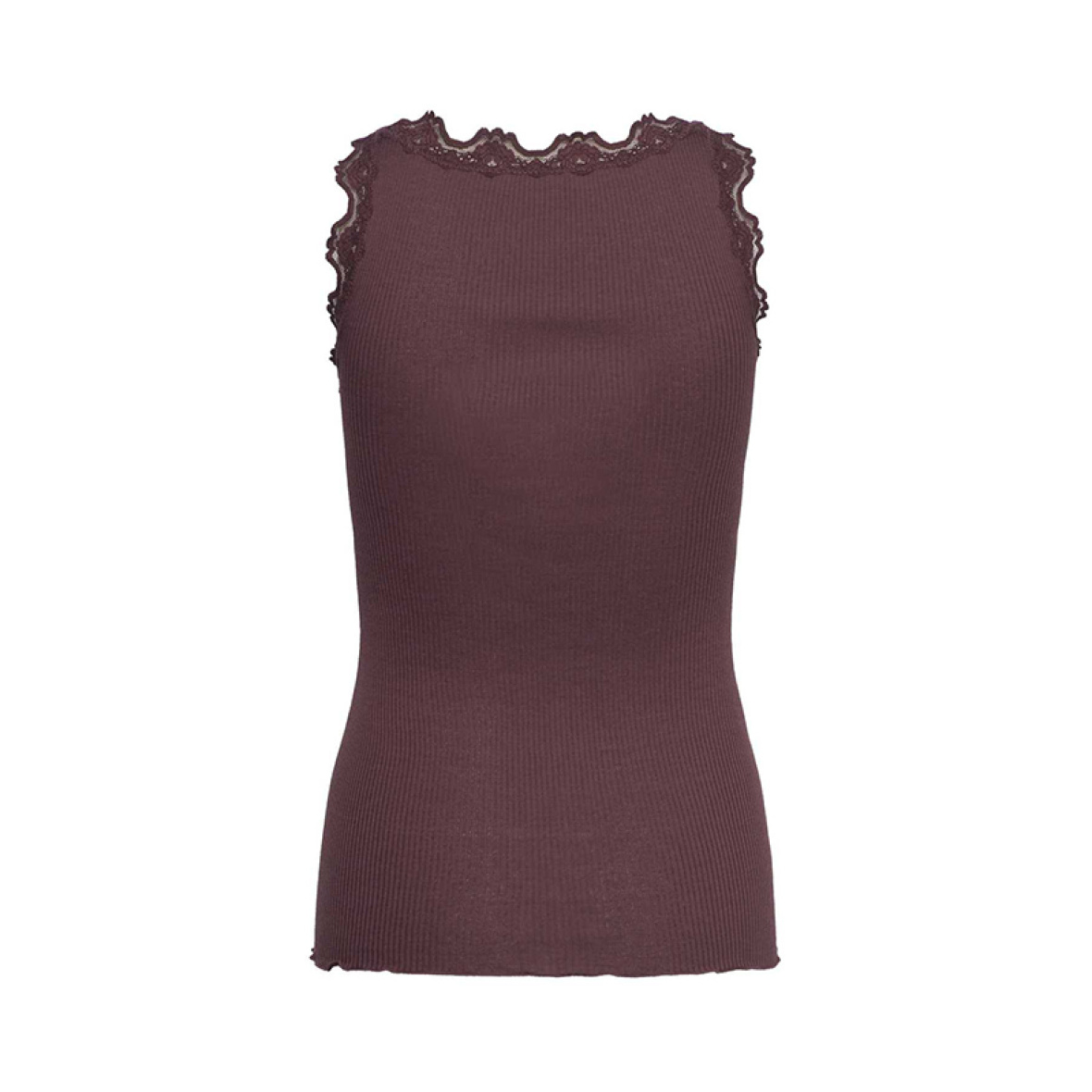 Toppen har en rund halsudskæring og fine blondekanter, der tilføjer et delikat touch.