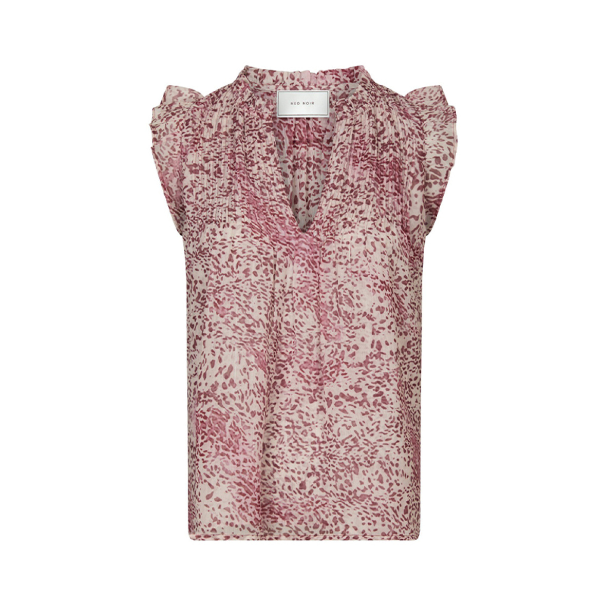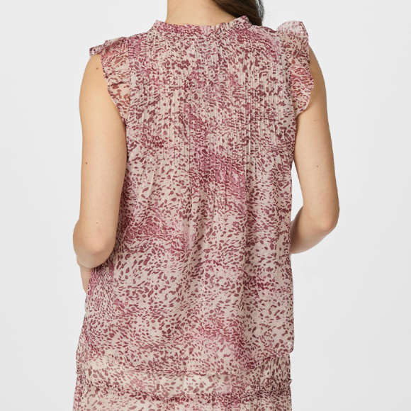 Smuk top i let chiffon med grafisk print og fine flæsedetaljer, der giver et feminint udtryk.