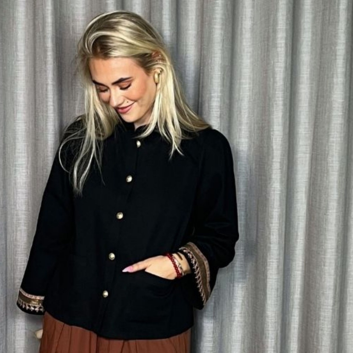 Jakken har lange ærmer, en lille kant i halsen og fine guldknapper langs fronten, der tilføjer et elegant touch.