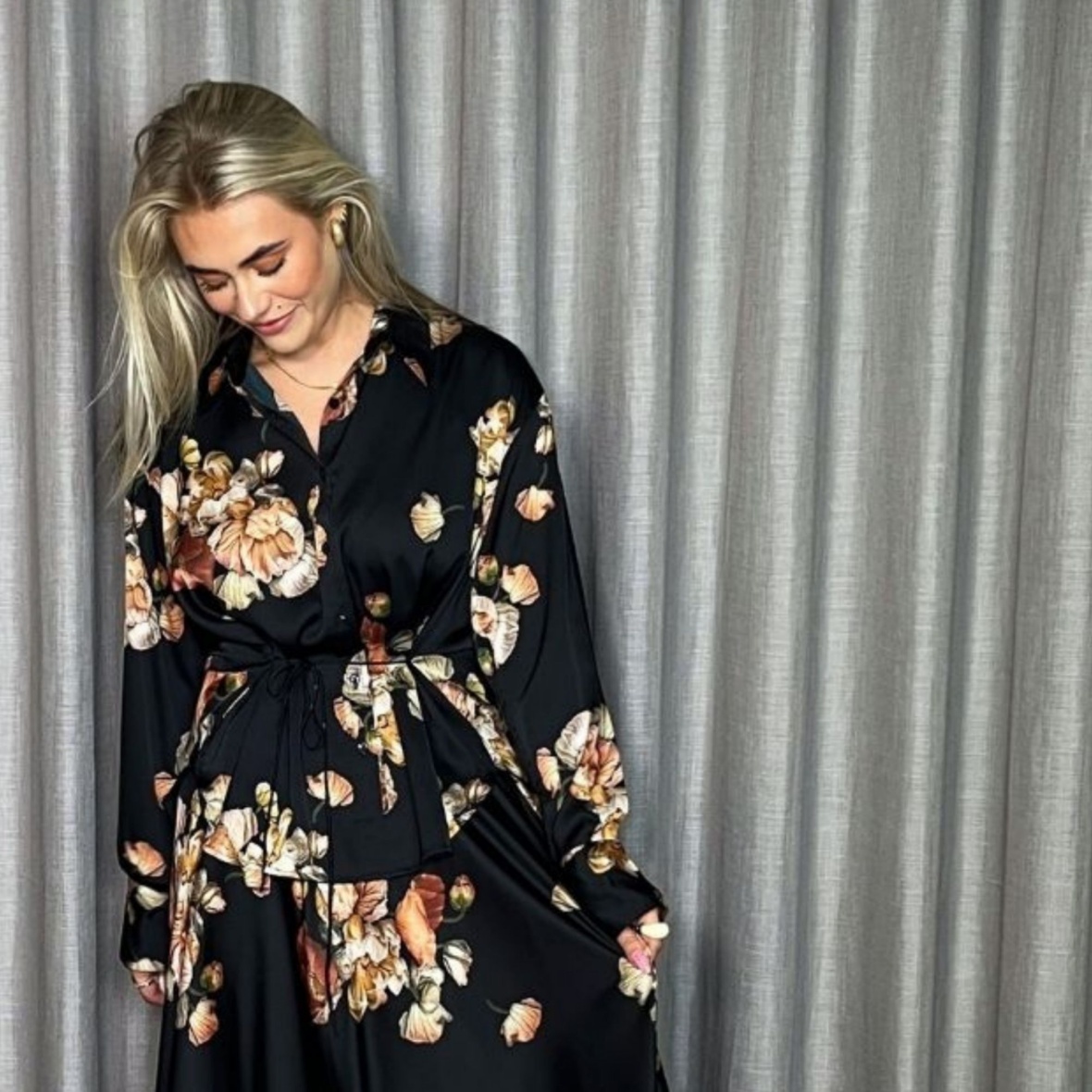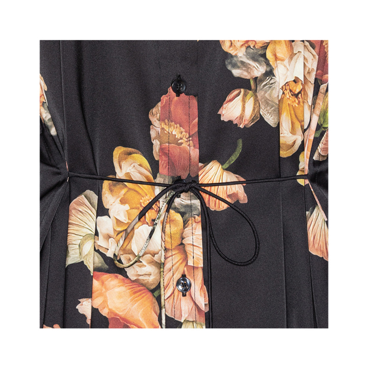 En elegant og feminin skjorte i sort med et smukt blomsterprint, der løber hele vejen rundt.