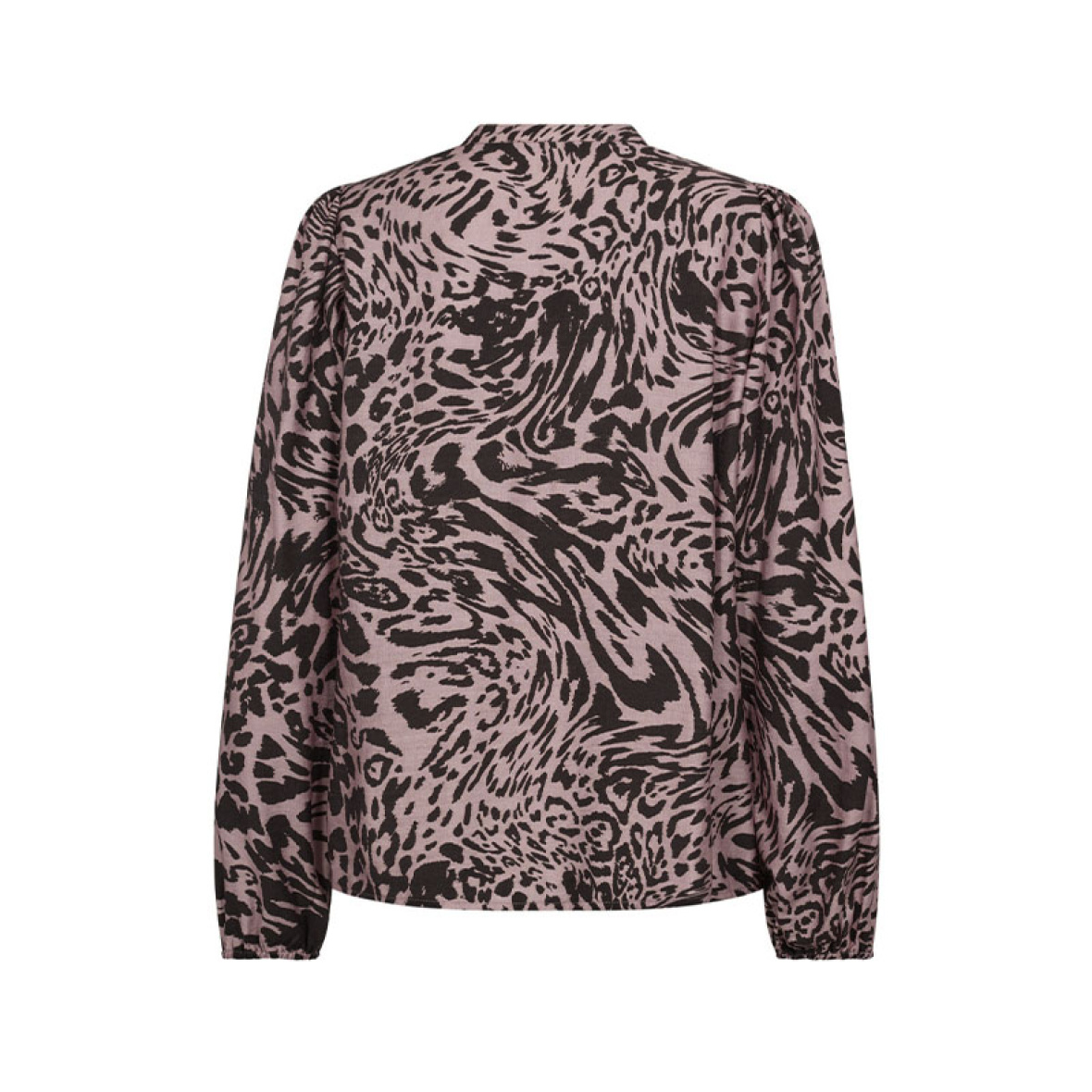 Denne rosafarvede skjorte er pyntet med et smukt sort print, der skaber et flot spil i stoffet.
