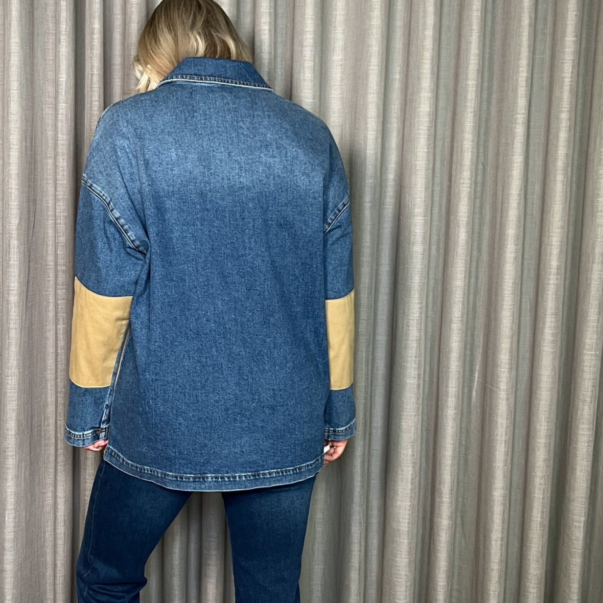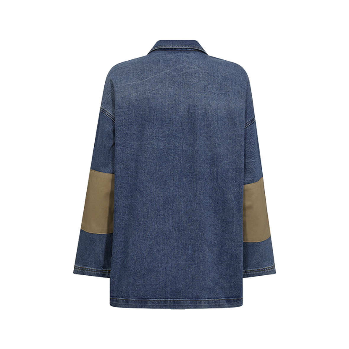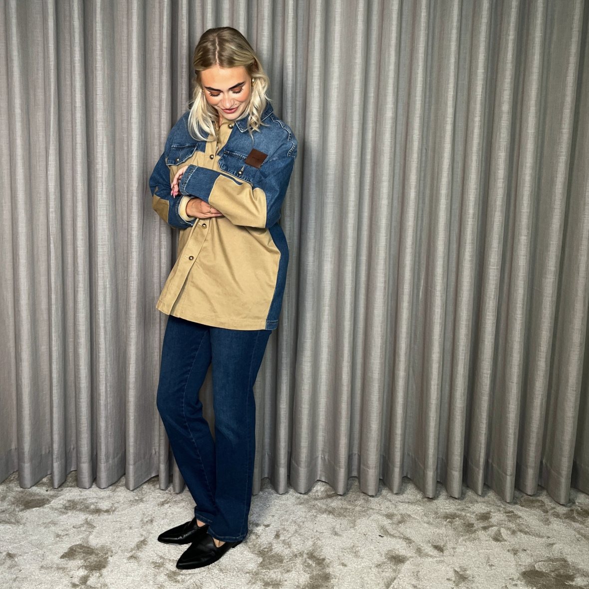 Denne lange denimjakke skiller sig ud med smukke beige detaljer, der løber rundt på jakken og tilfører et eksklusivt udtryk.