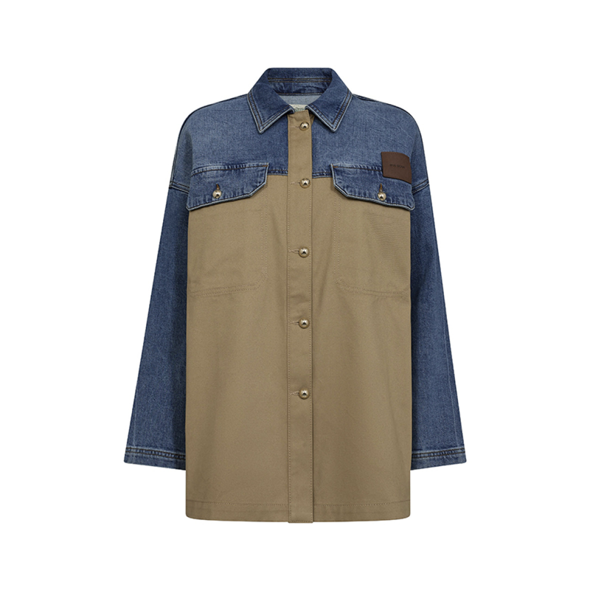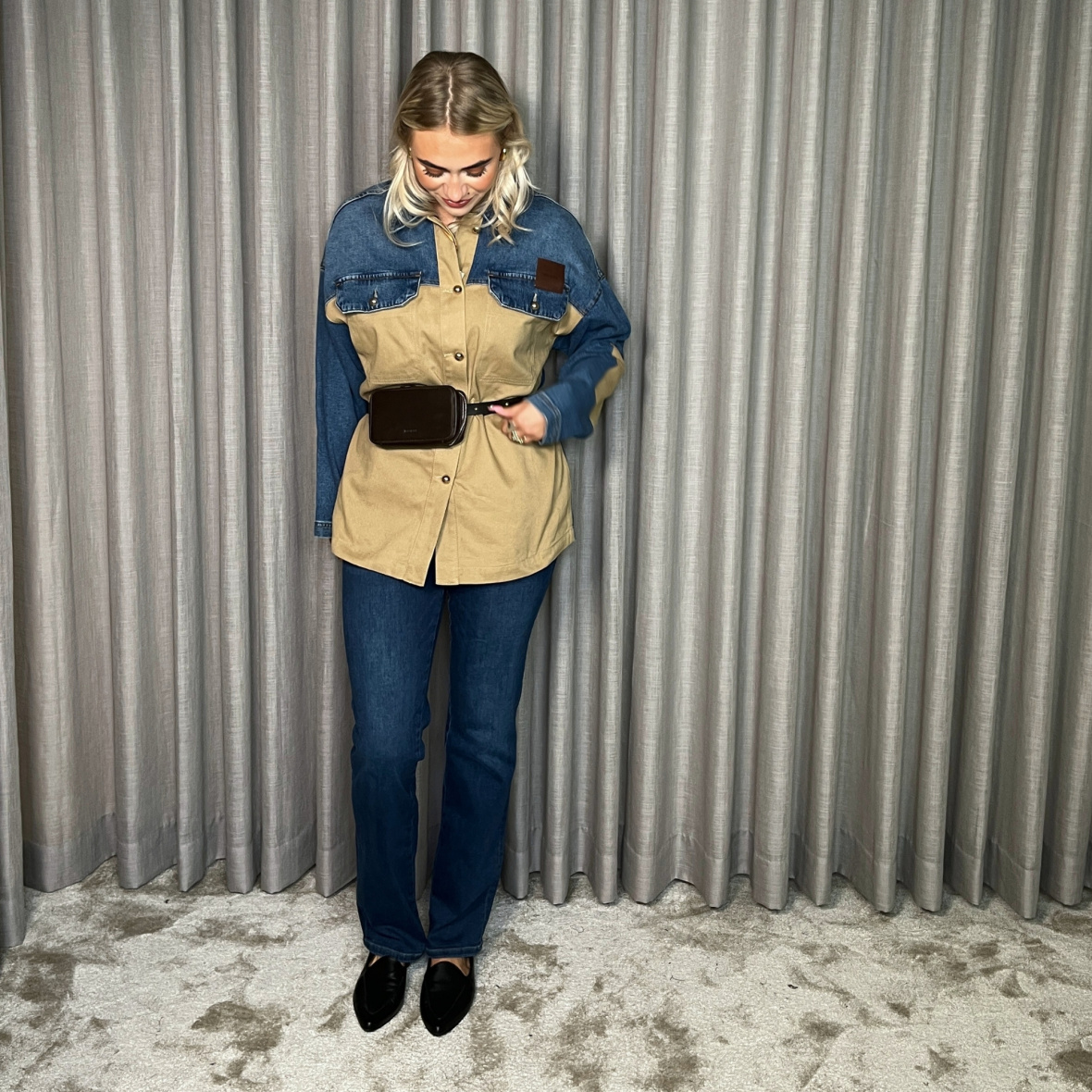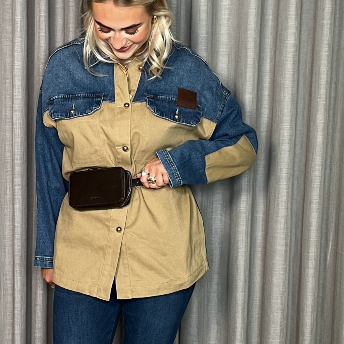 Denne lange denimjakke skiller sig ud med smukke beige detaljer, der løber rundt på jakken og tilfører et eksklusivt udtryk.