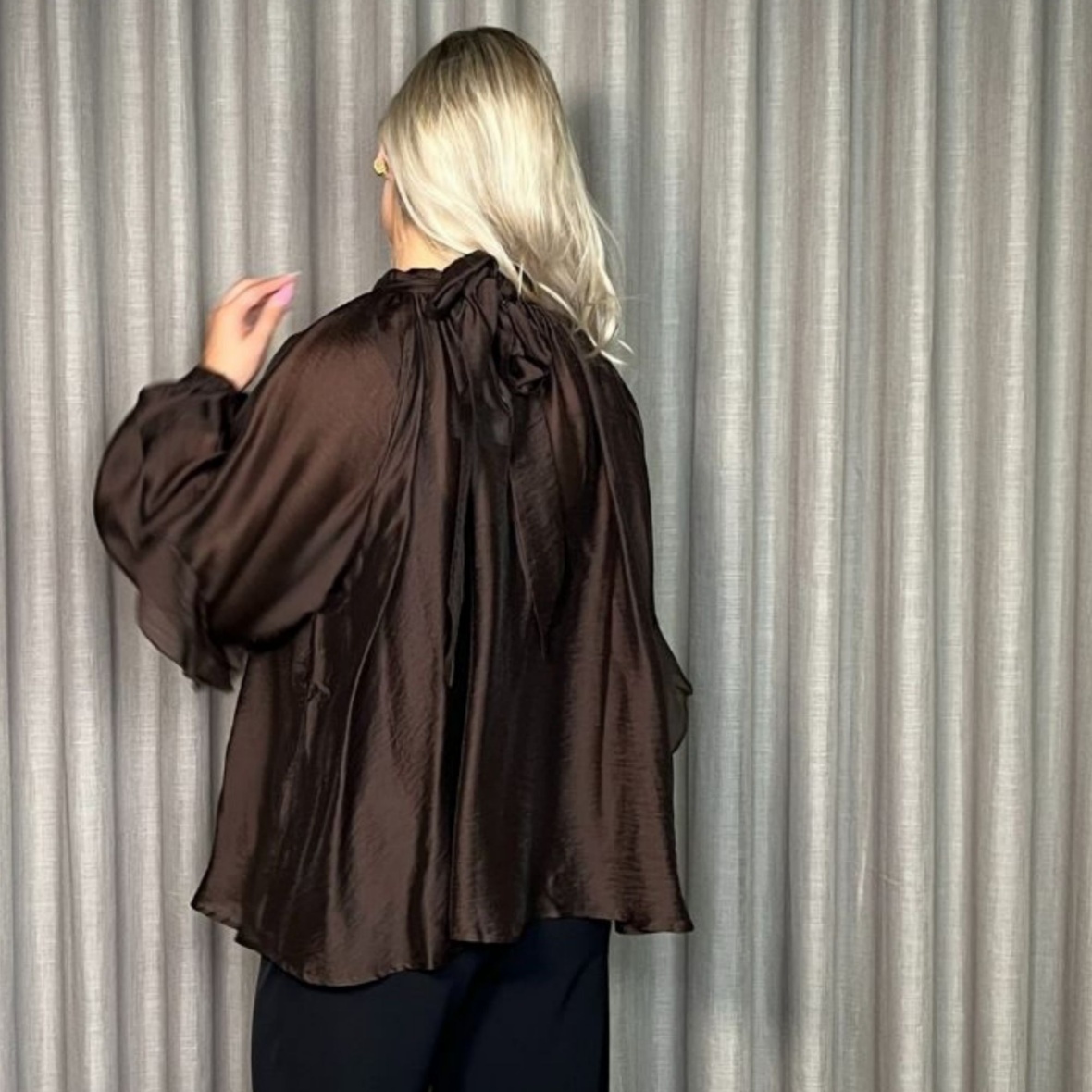 Den særlige detalje er, at den kan vendes og bruges på begge sider – vælg mellem en høj hals foran eller en elegant sløjfe i nakken.