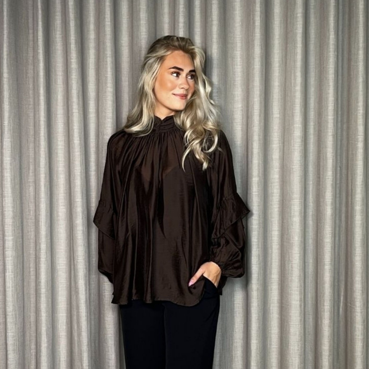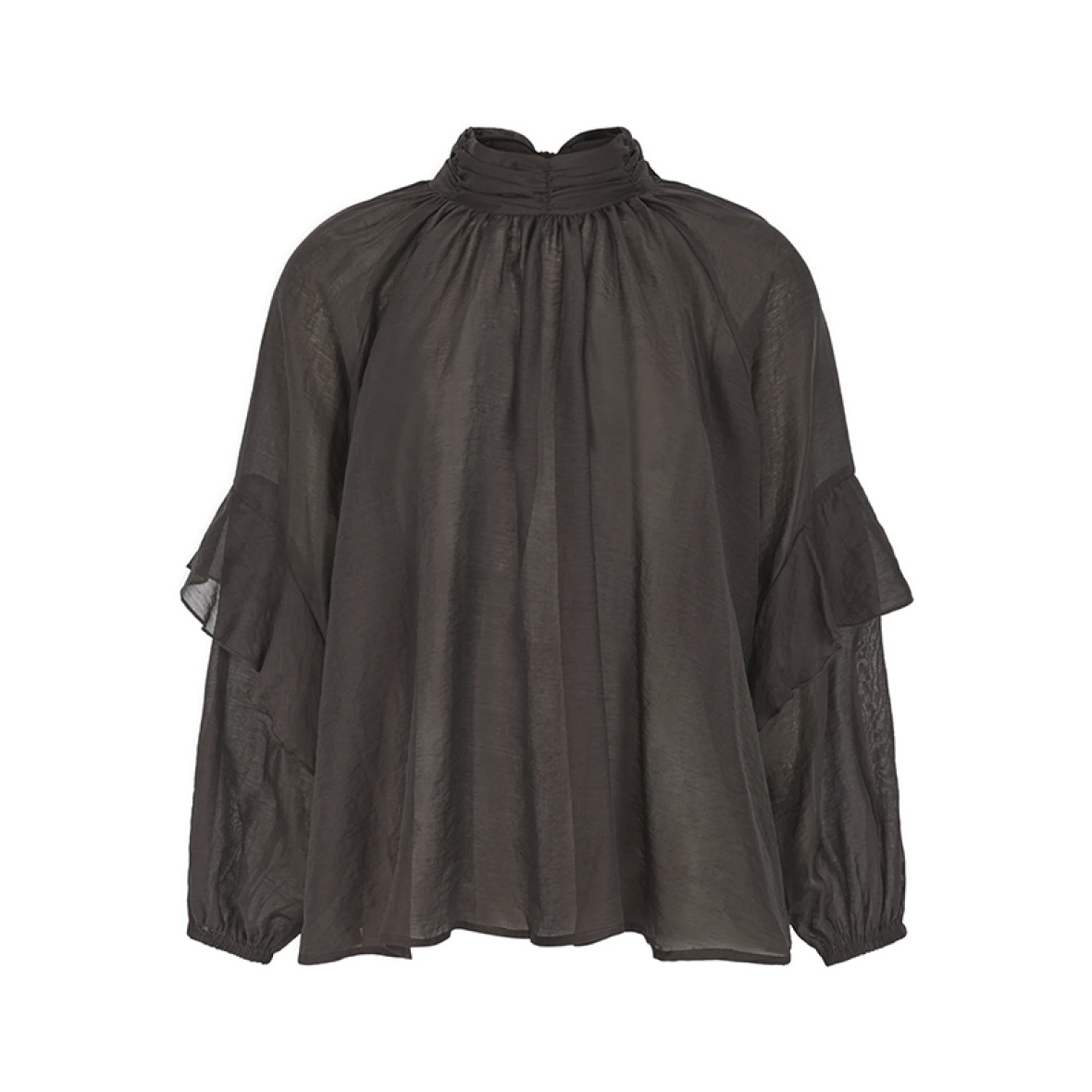 Blusen har en løs pasform med fine flæser på ærmerne og elastik ved håndleddene for ekstra komfort.