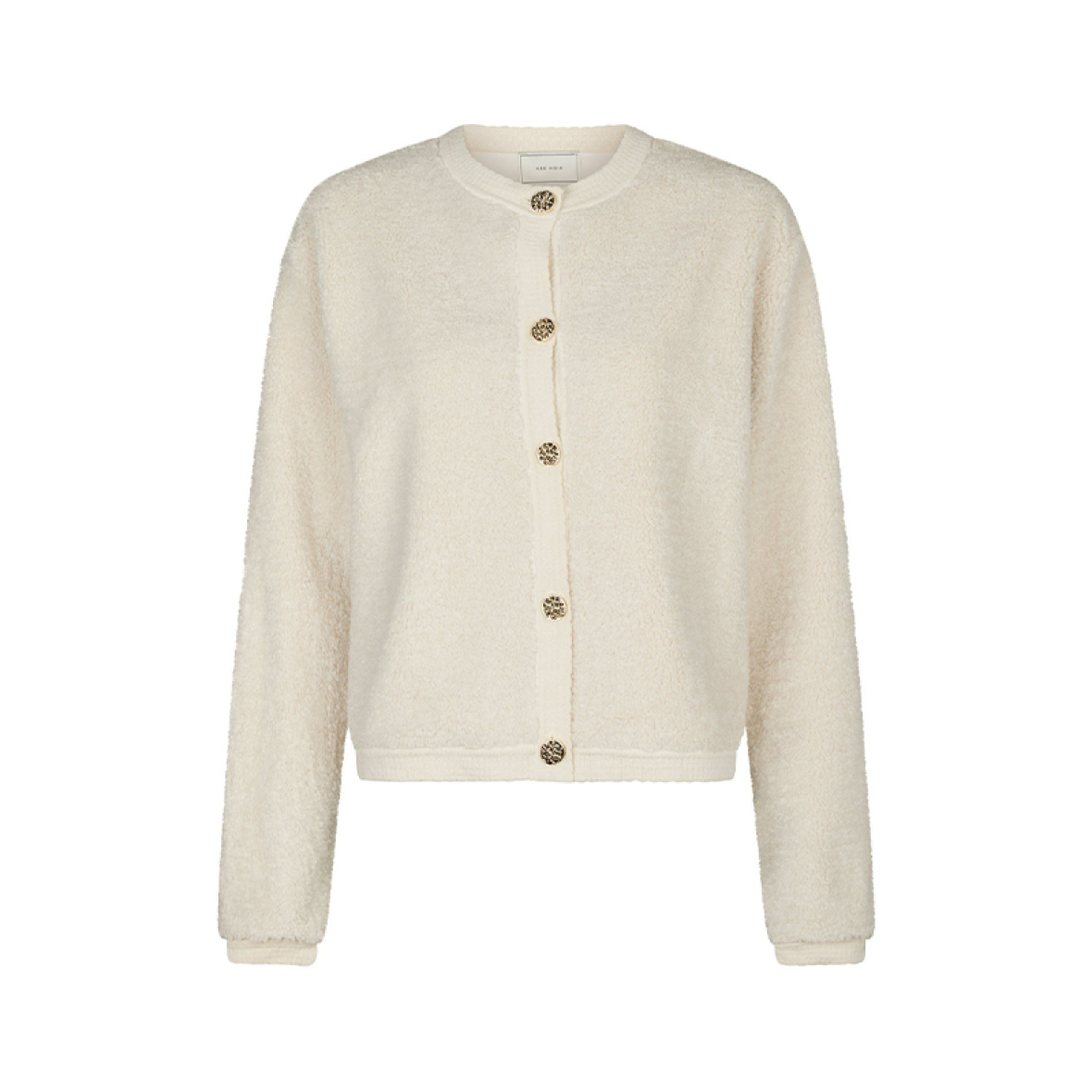 Kort strikket cardigan i en blød kvalitet med 2 lommer, den lukkes med dekorative knapper foran.