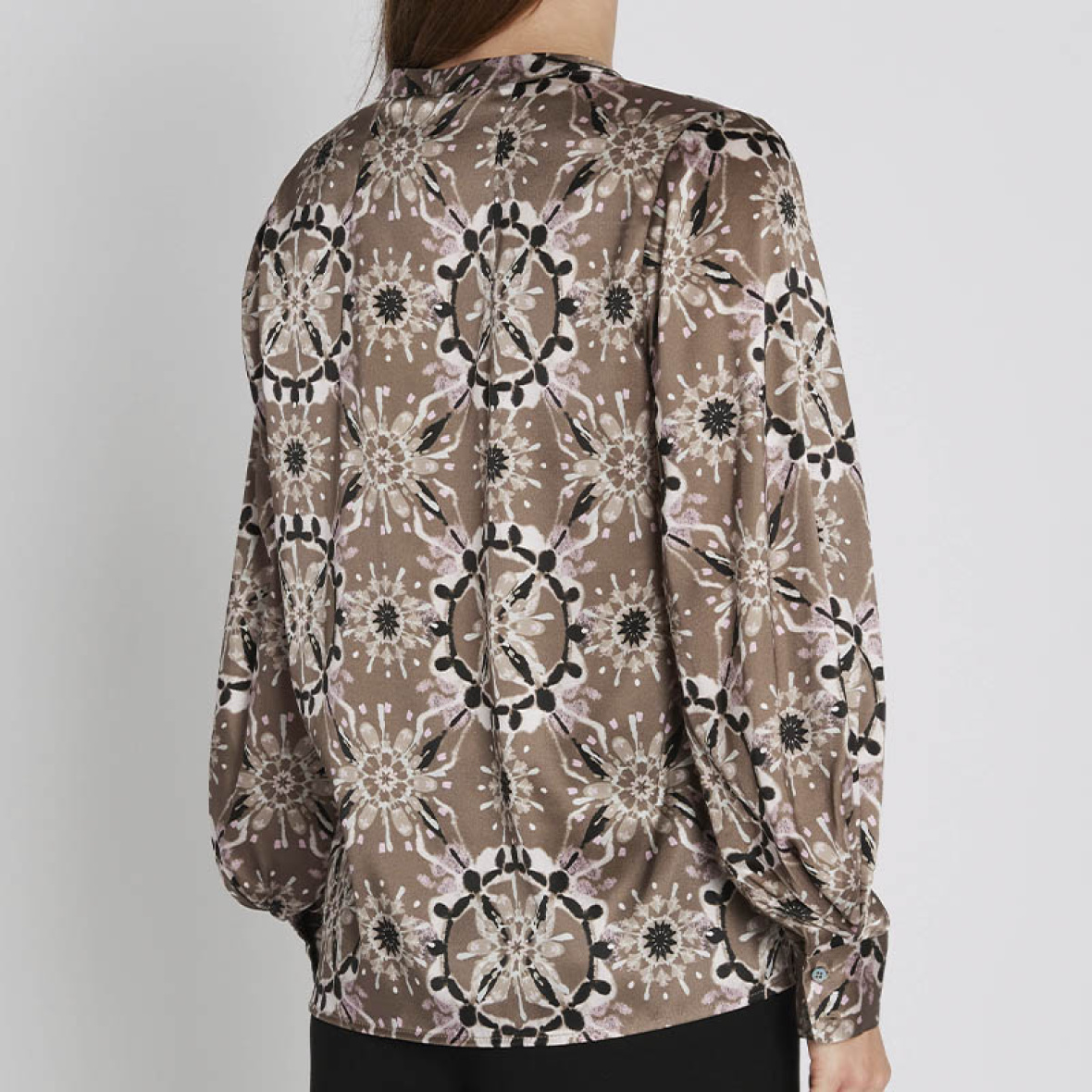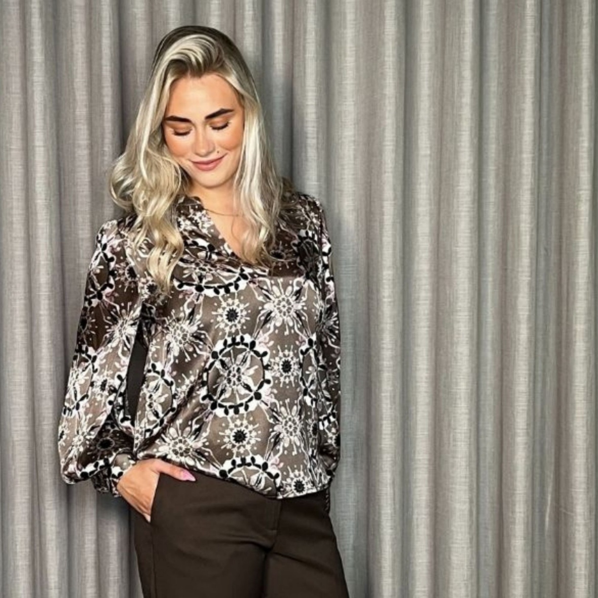 Den har en flatterende v-hals og et fint mønster, som giver et feminint og stilfuldt udtryk.