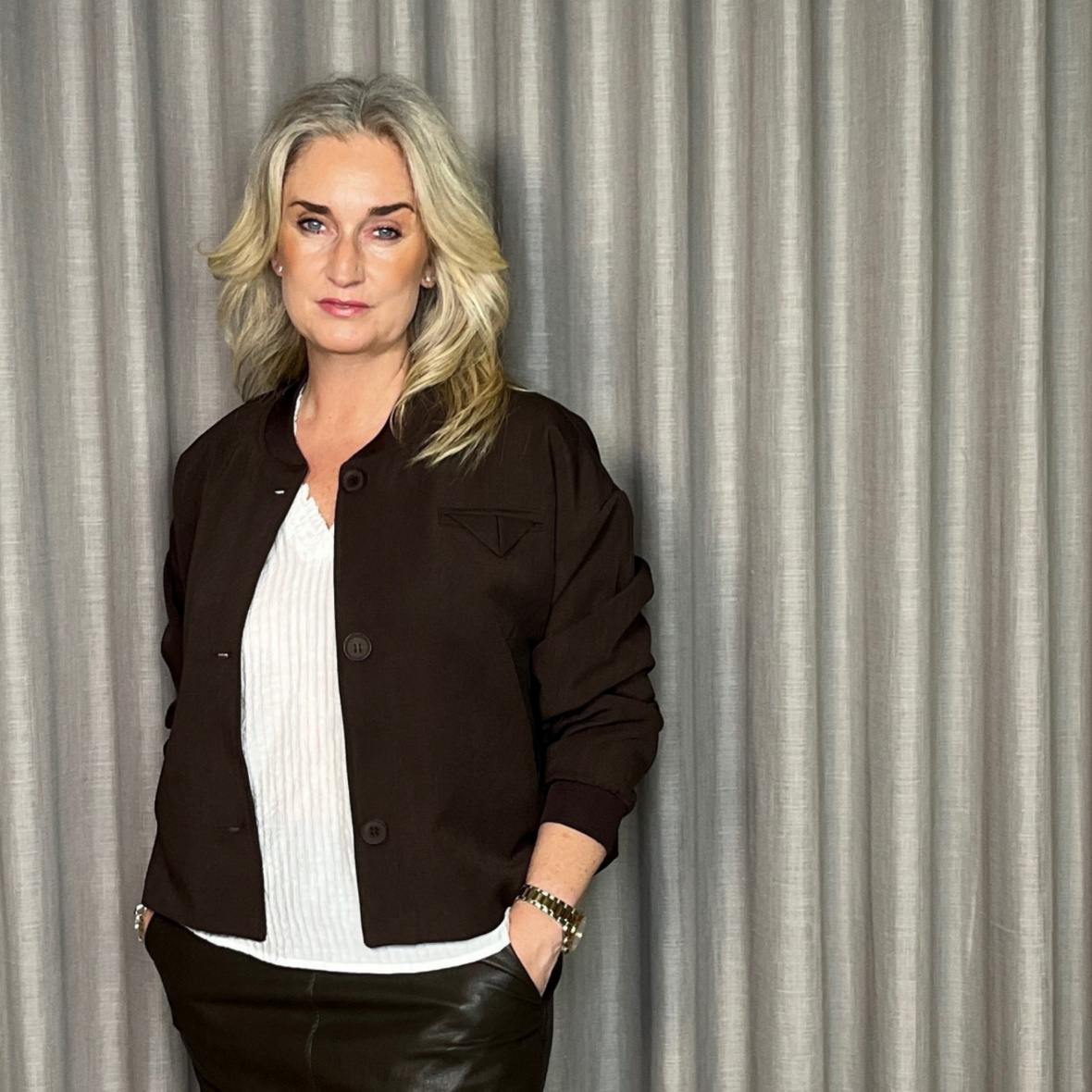 Great-ja er en kort jakke med lange ærmer og ribkant ved hals, ærmer og bund.Den har knaplukning foran, en brystlomme med klap og en praktisk sidelomme.