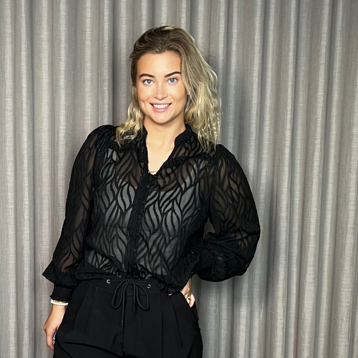 Elegant sort skjorte med v-hals og et let gennemsigtigt materiale, der giver et feminint og luftigt udtryk.