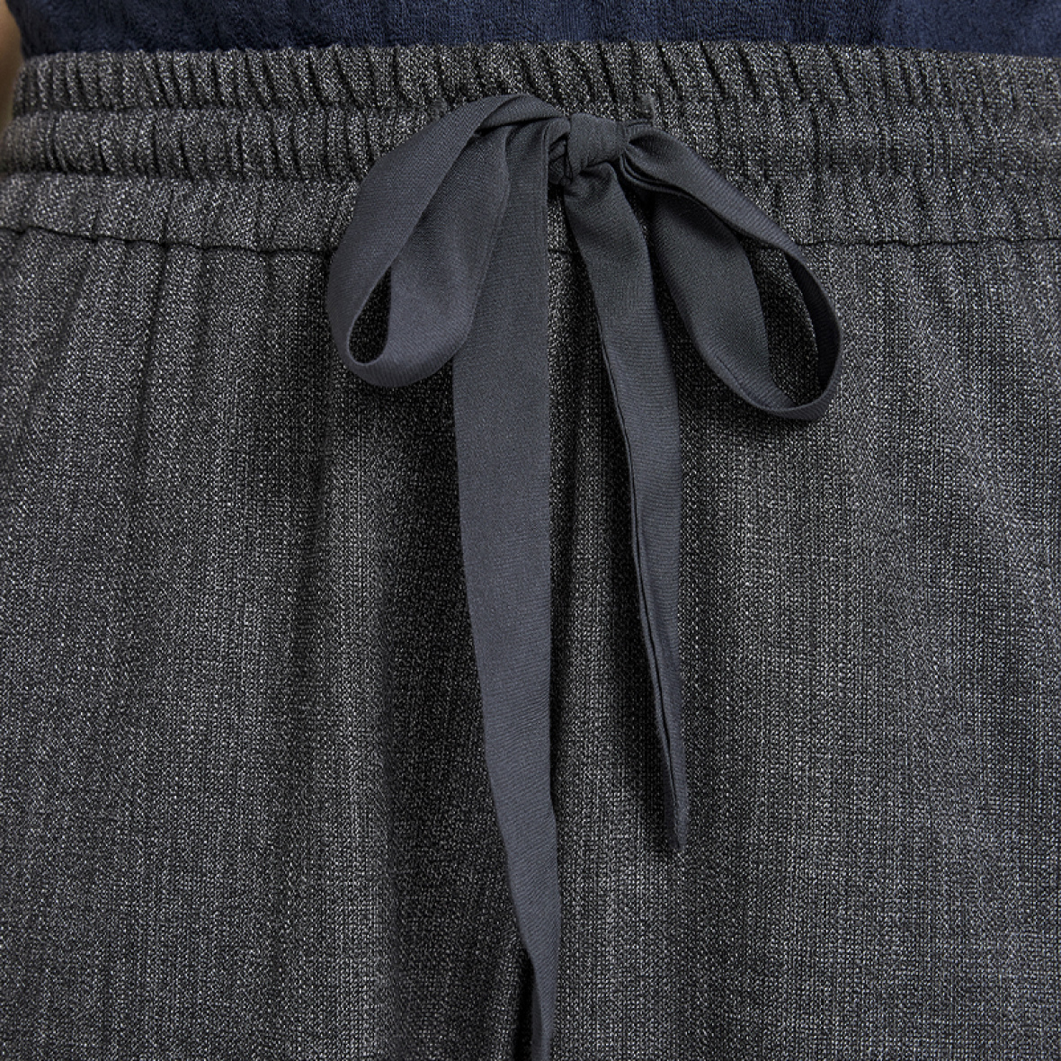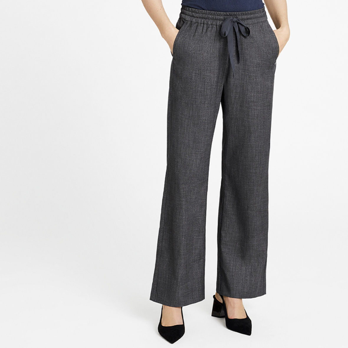 De har elastiktalje med bindebånd, lige ben, lommer i siden og snydebaglommer.