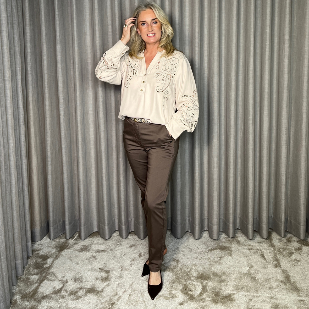 Blusen er prydet med smukke broderier foran på brystet og ned ad ærmerne, som giver et feminint og unikt udtryk.