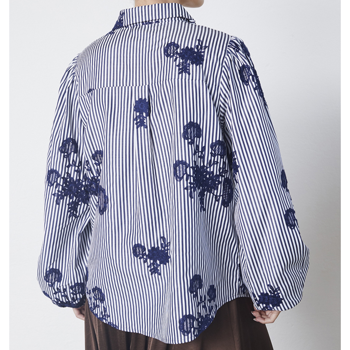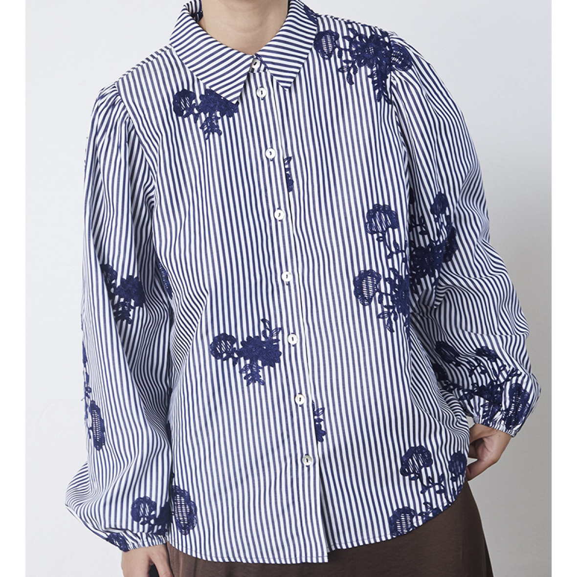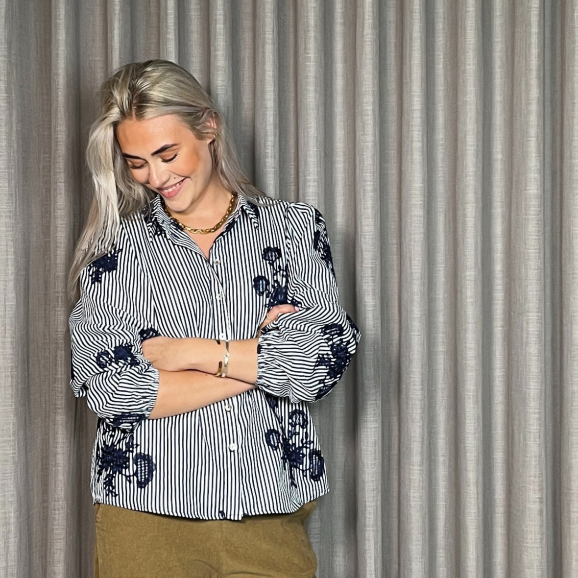 Stribet skjorte i hvid og blå med særligt blåt broderi, klassisk krave, knaplukning og let voluminøse ærmer.