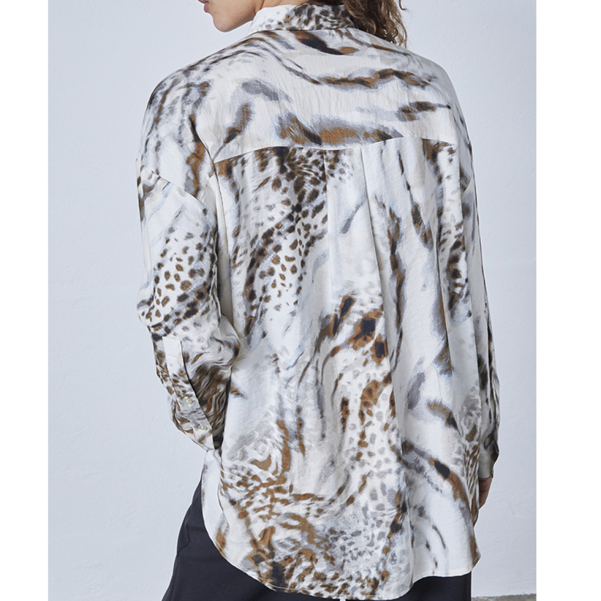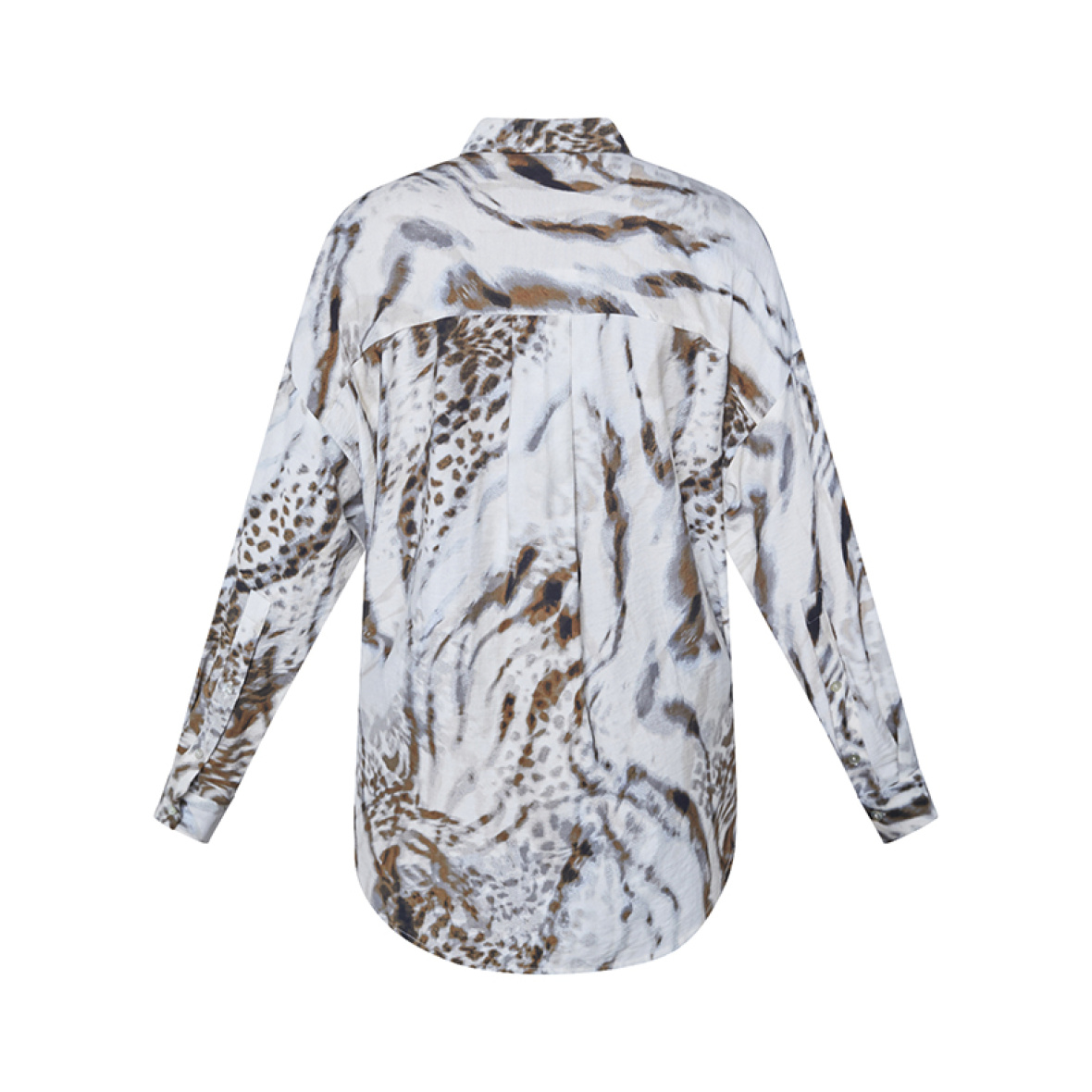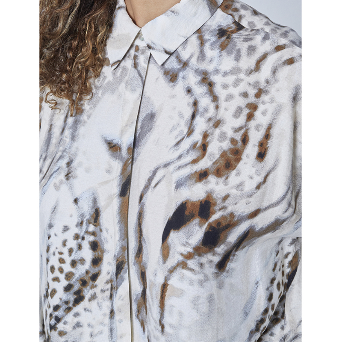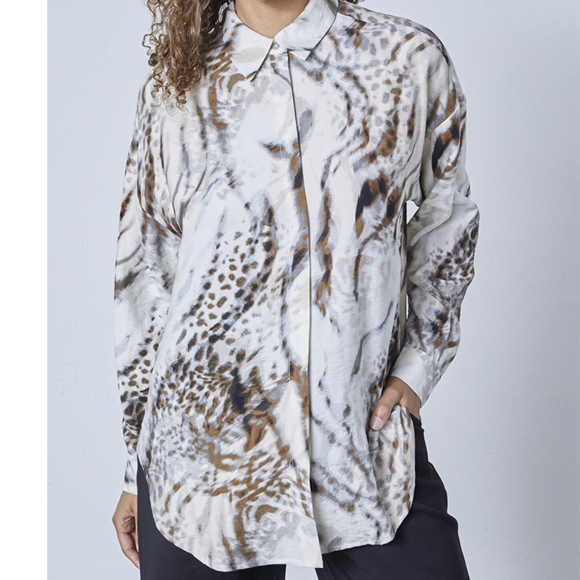 Den har skjult knaplukning, lange ærmer med manchetter og en løs, behagelig pasform.