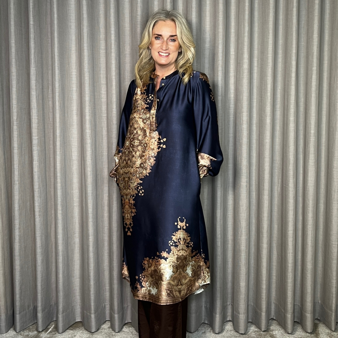 Elegant kjole med eksklusivt print, ståkrave og dekorative knapper.