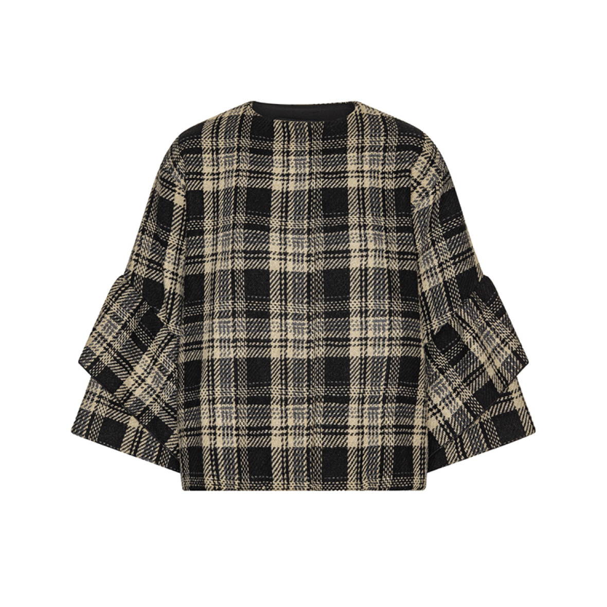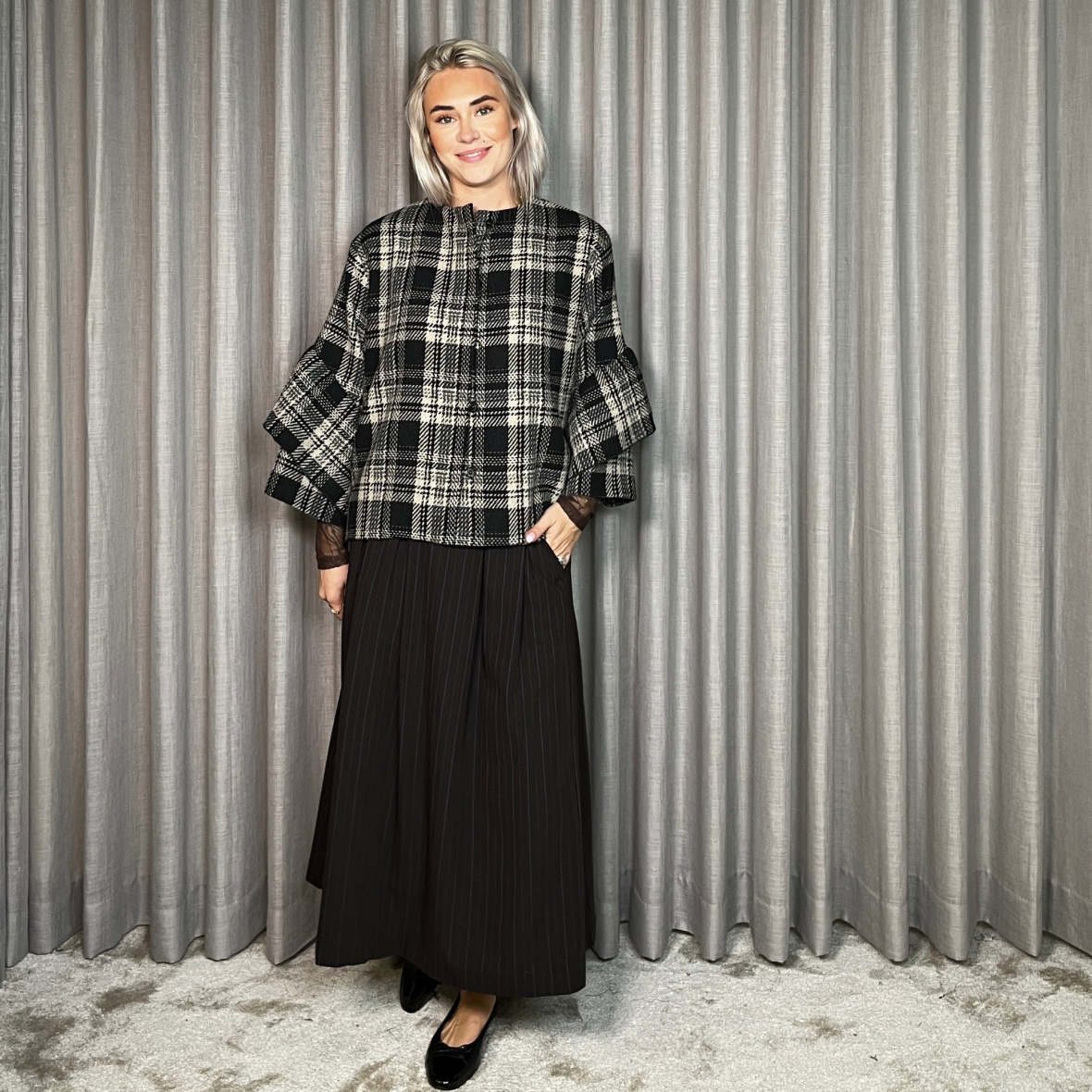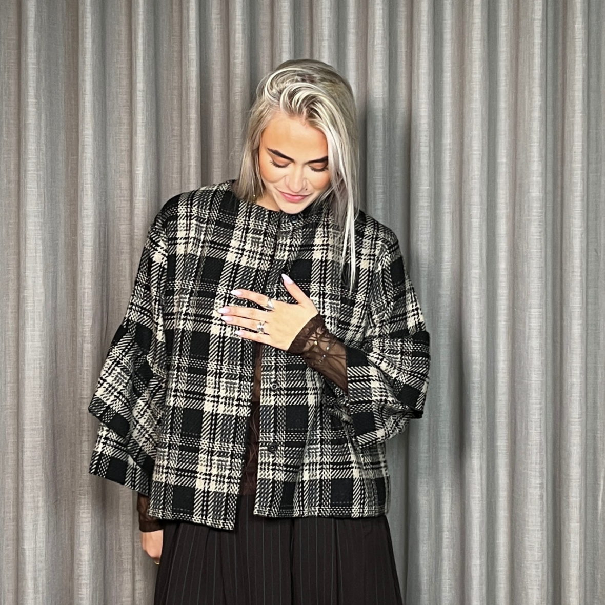 Spencer jakken er en kort, limited edition jakke med peplum-ærmer og flæsedetaljer.Den gennemknappede jakke, kombinerer blød satinindlæg med varm uld yderst.