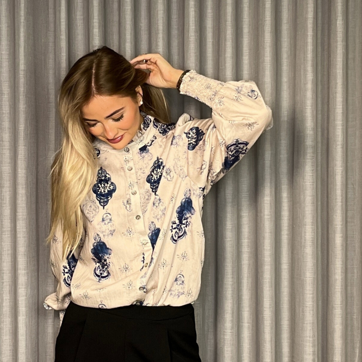 Langærmet skjortemed flæsekant ved kraven og et print inspireret af blå-hvid delftware.
