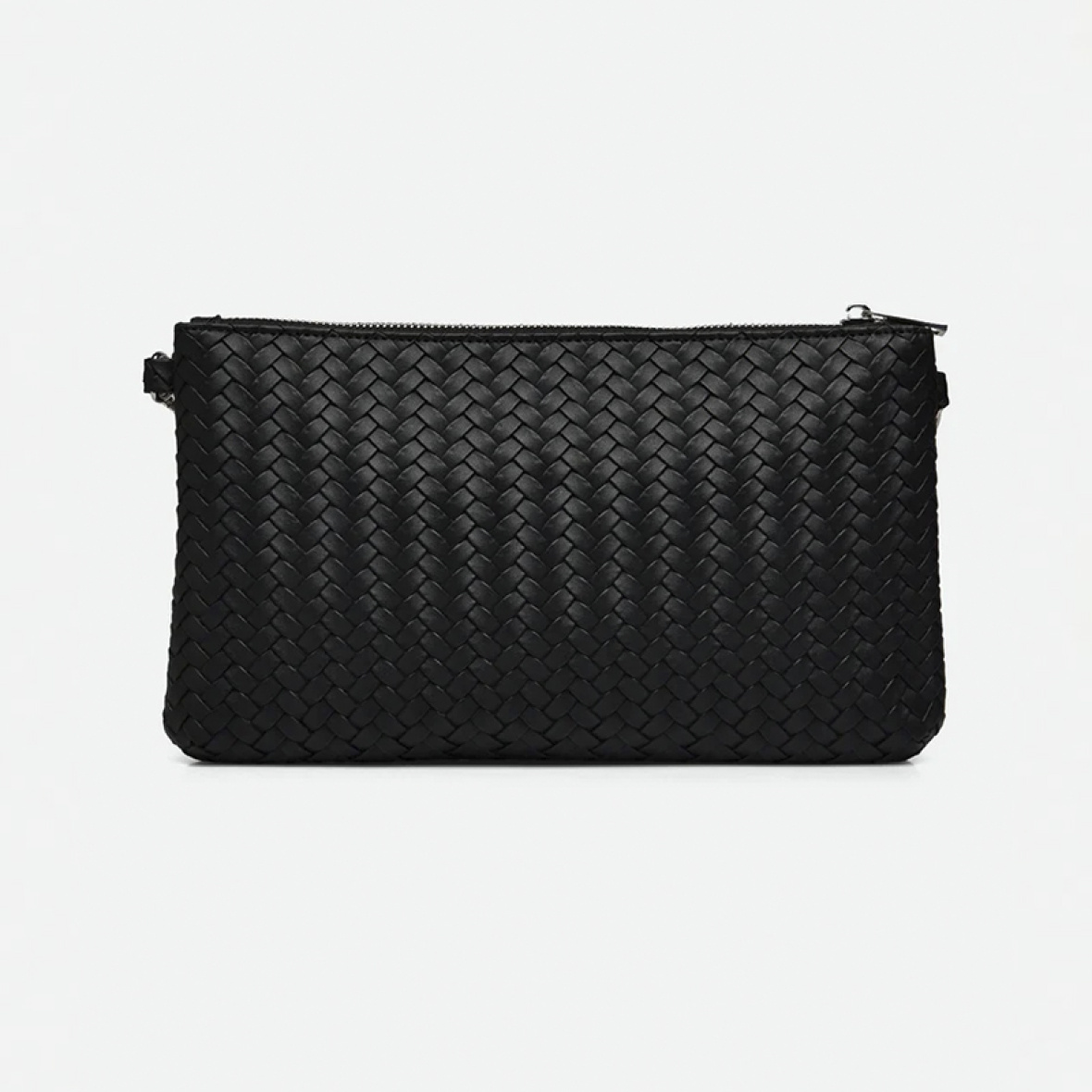 Elegant sort clutch i flettet materiale med en smuk sølvlynlås.