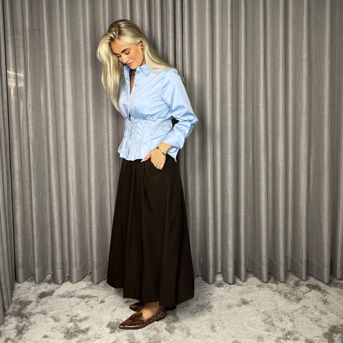 Dameskjorte med læg, klassisk krave, lange ærmer med manchet og let figursyet pasform med fine rynkedetaljer i taljen.