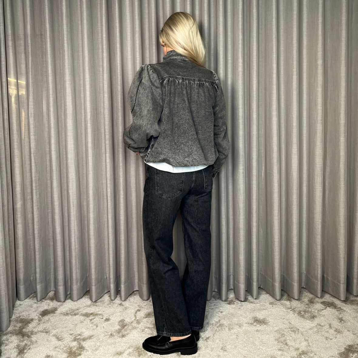 Stilfuld grå denim-look jakke med lange ærmer og let puffeffekt ved skuldrene.