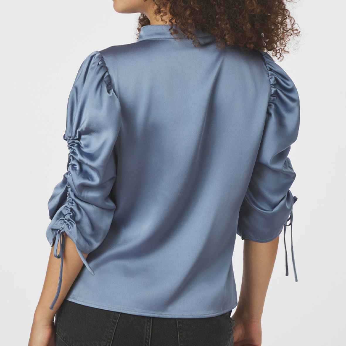 Fin blå bluse med V-hals og puffærmer, hvor en snor løber igennem og skaber en smuk detalje.