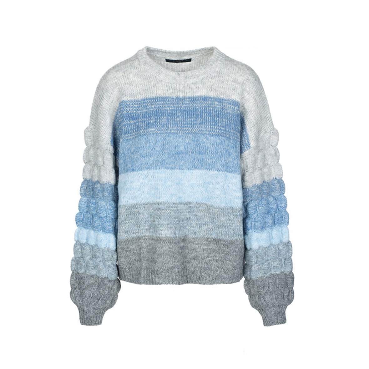 Smuk striktrøje i blå og grå nuancer med brede striber og en lækker, chunky struktur.