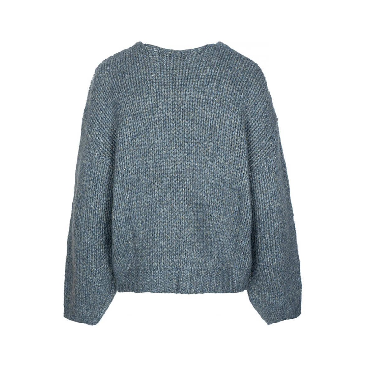 Fin striktrøje med V-hals og lette ballonærmer, der giver et feminint og moderne udtryk.