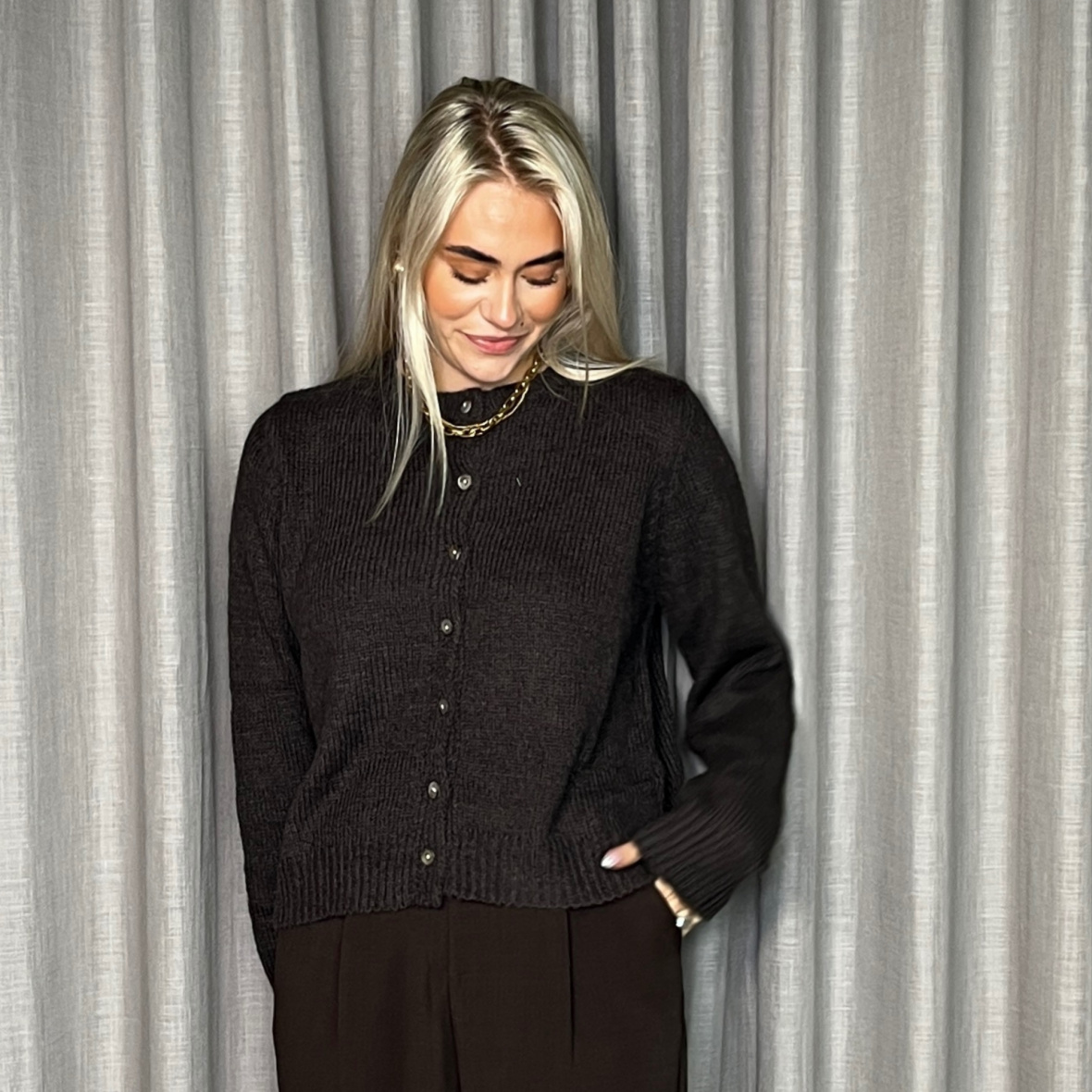 Den let løse pasform og de stilrene ribdetaljer gør den til et elegant valg, der er perfekt som et ekstra lag over kjoler eller bluser, og kan bruges året rundt.