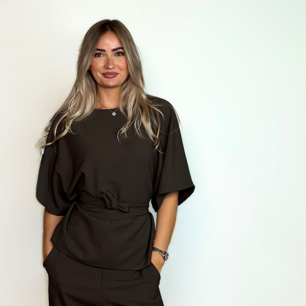 Brug det matchende bælte til at fremhæve taljen og skabe en feminin silhuet, perfekt med jeans og mules.