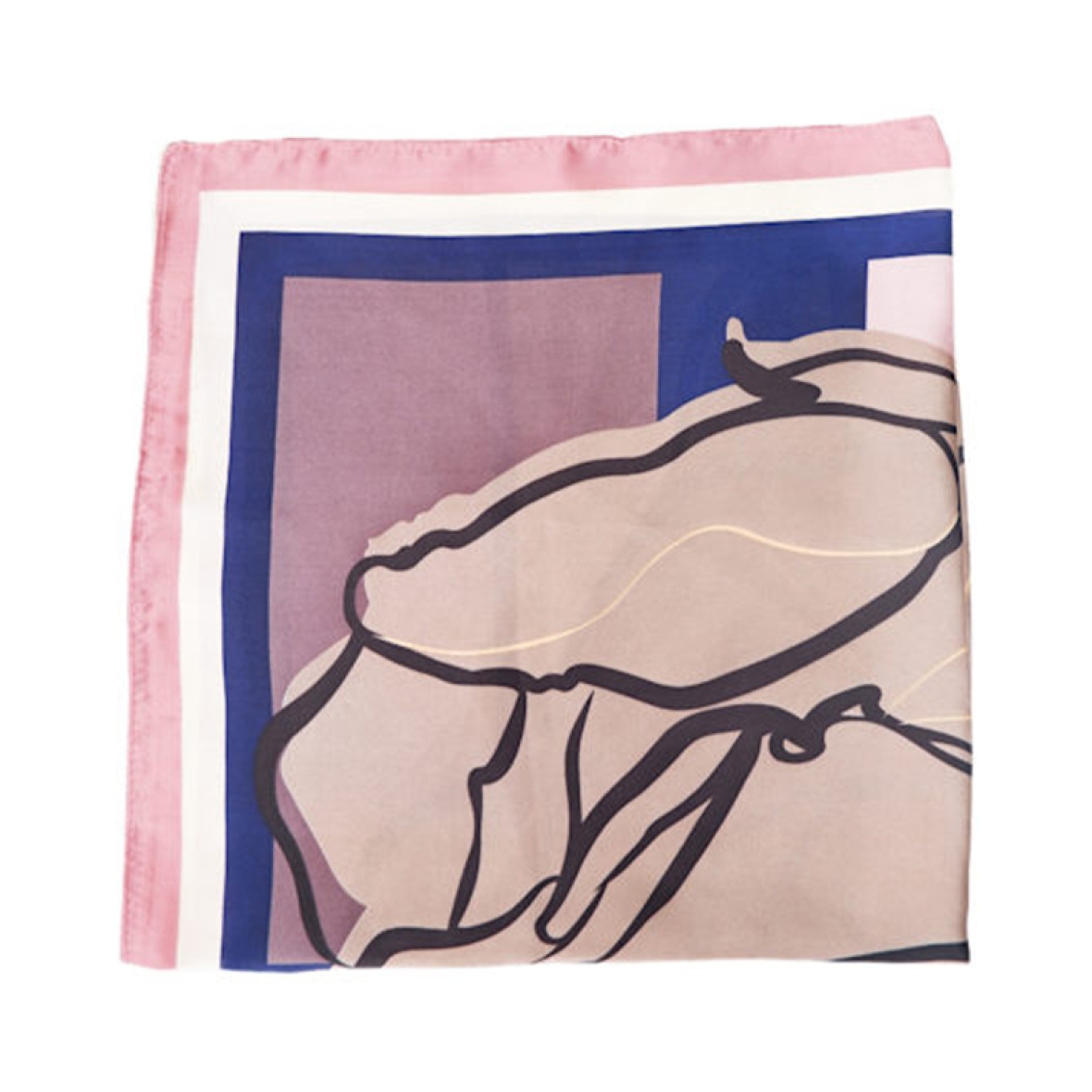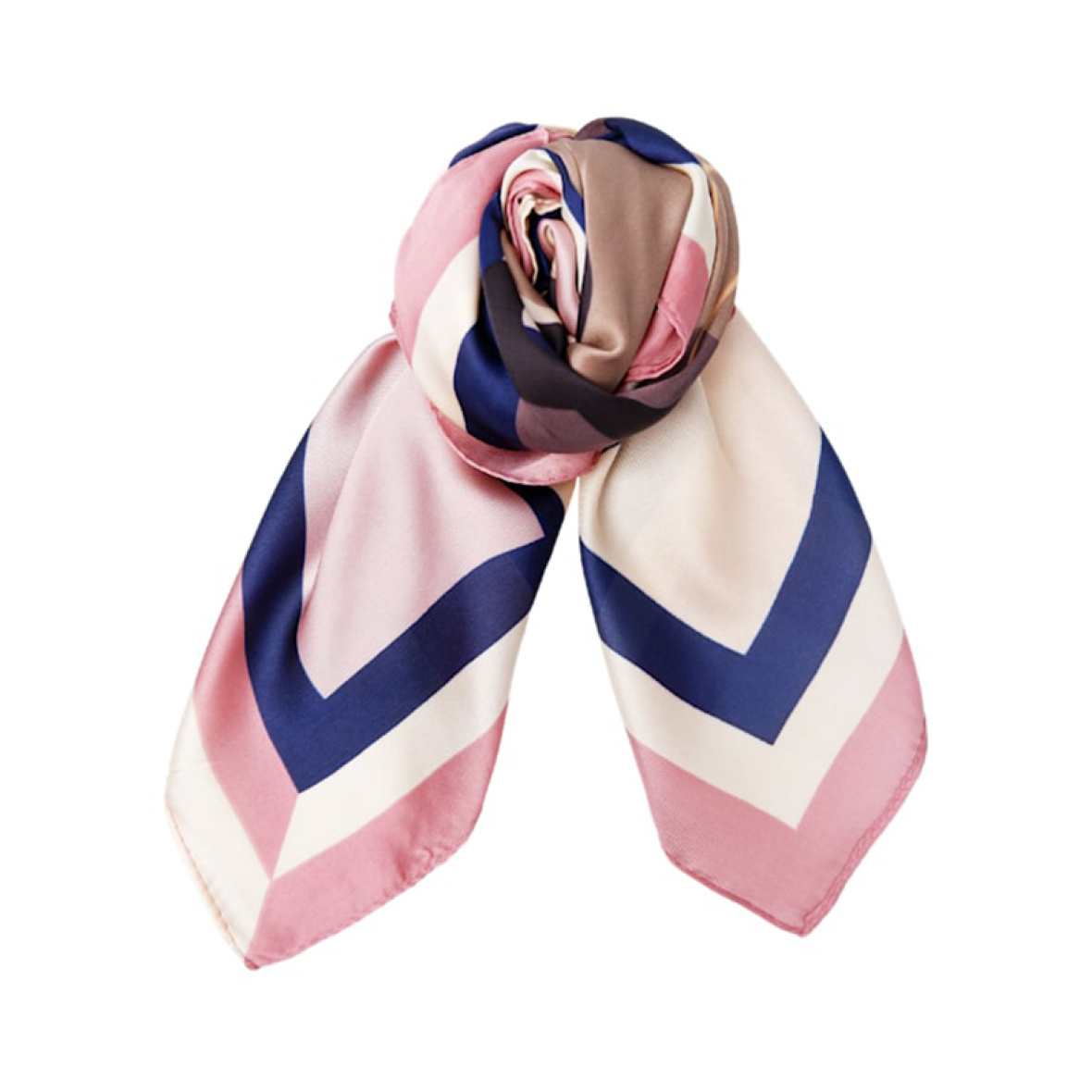 Dette skønne tørklæde har et smukt grafisk mønster i elegante nuancer af lyserød, mørkeblå og beige.