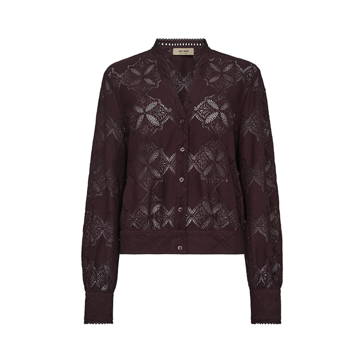 Elegant blondebluse i normal pasform med smuk mandarin-krave og v-udskæring med knaplukning.