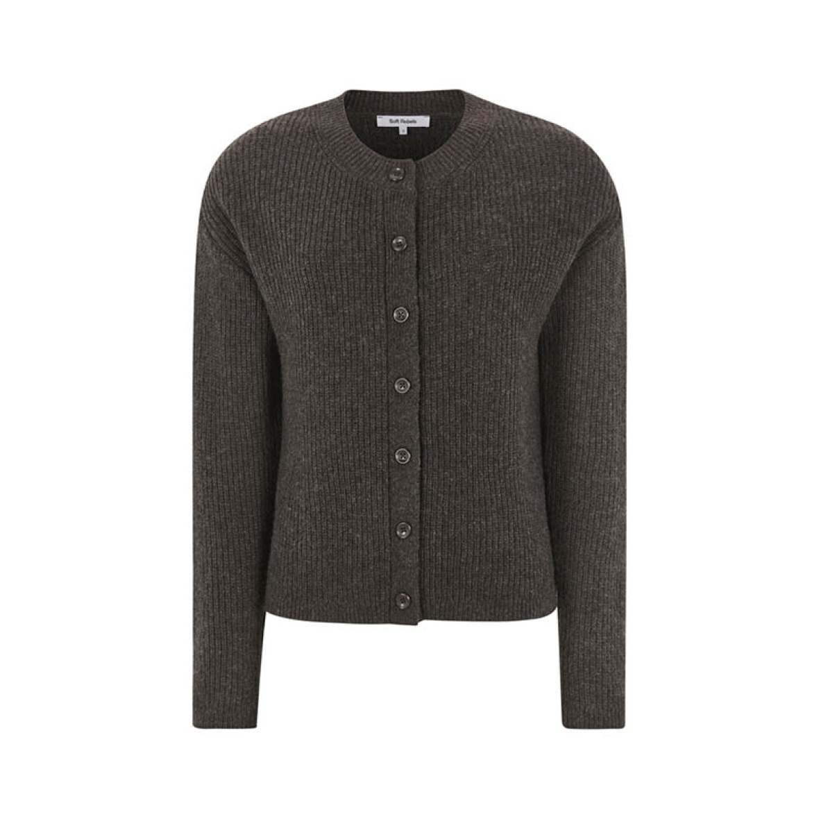 Skøn chokoladebrun West cardigan fra Soft Rebels i blød og lun uldkvalitet.