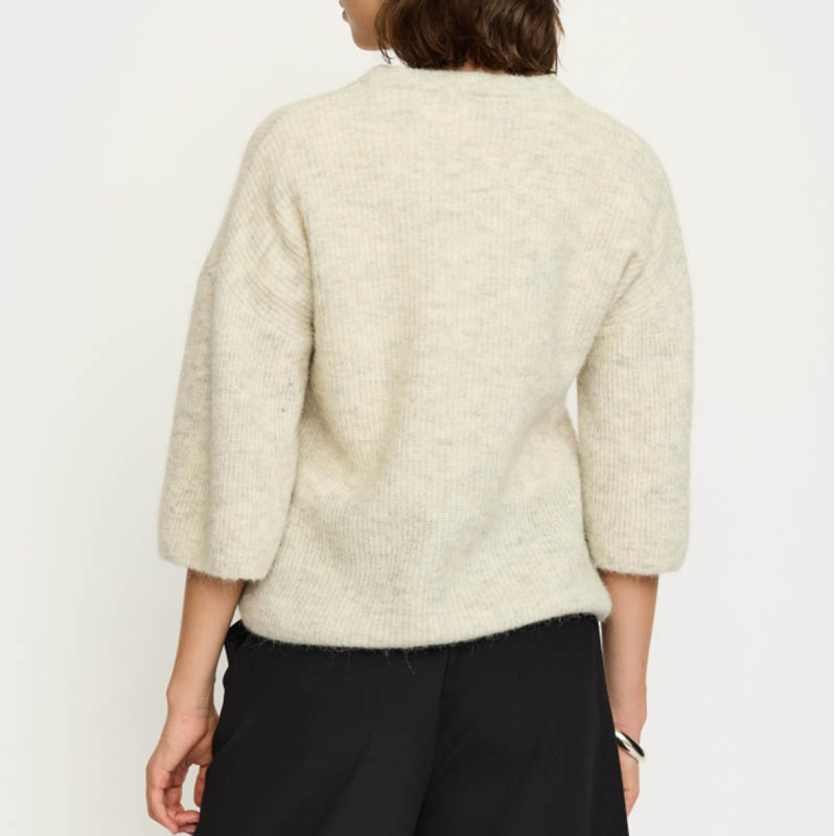 Den er designet med en elegant rund hals og smukke 3/4 ærmer, som giver den et stilrent og moderne udtryk.