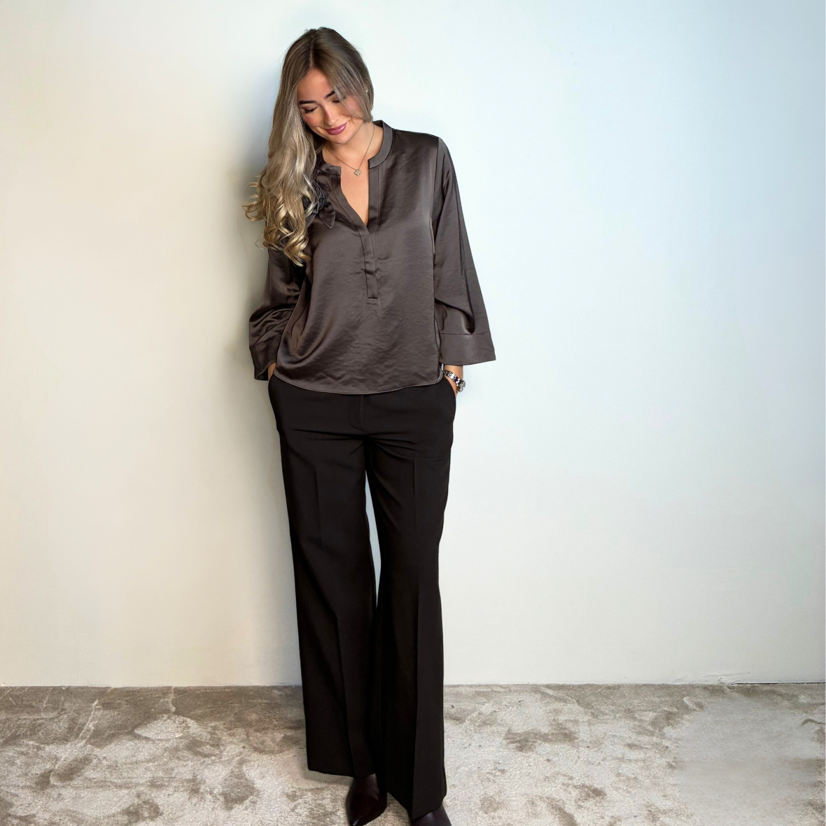 Skønne habitbukser fra Haute L’Amitié i smuk struktureret kvalitet. Bukserne har skrålommer, bæltestropper og klassisk knap- og lynlåslukning. Løs bootcut-pasform med lang benlængde giver et elegant og stilrent look.